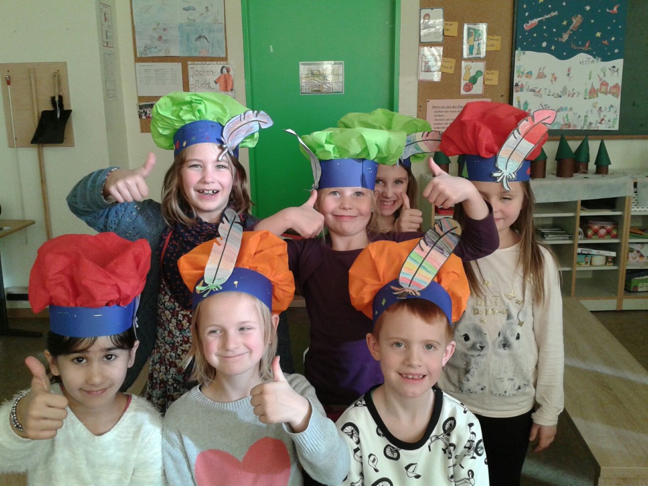 Enthusiastisch bastelten die Kinder der zweiten Klasse ihre Pietenmützen. Nun sind sie eigentlich perfekt vorbereitet um weiter zur Pietenschule zu gehen um zu lernen wie man ein echter „Piet“ wird.