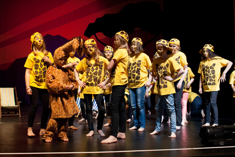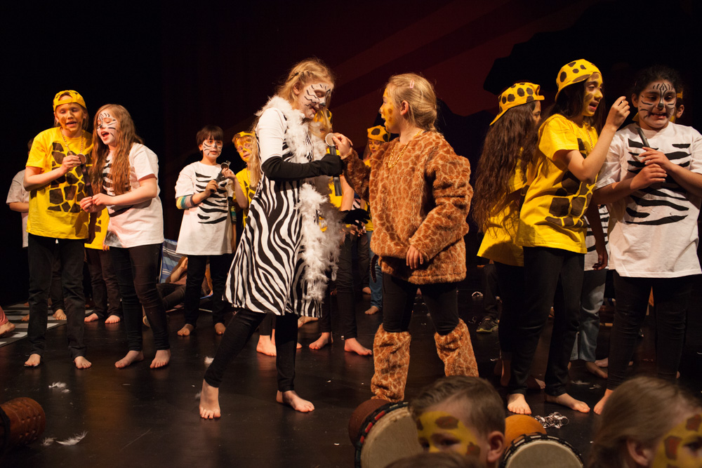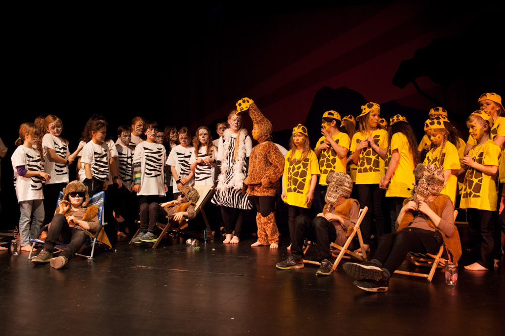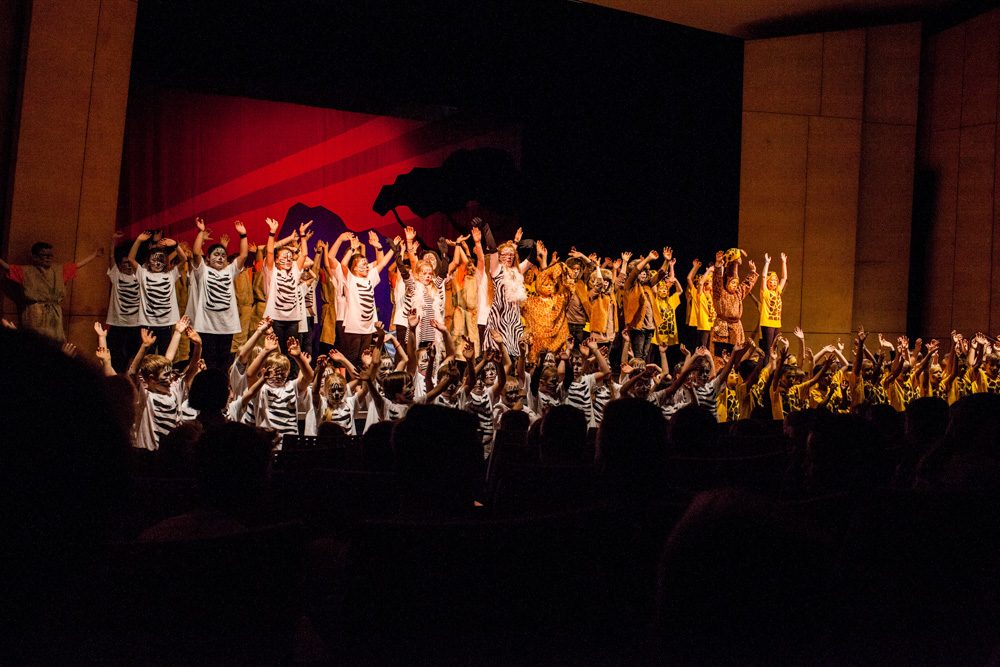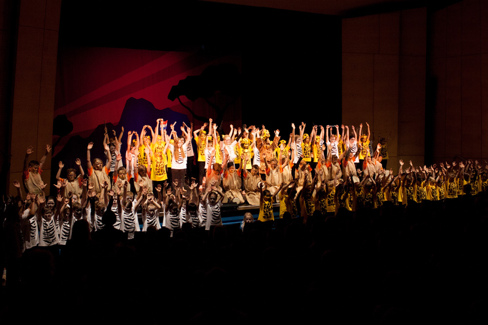 Mehr als 450 Zuschauer warten im Konzert- und Theatersaal und sind gespannt auf unser Musical. Alle „Tiere“ haben sich auf und vor der Bühne aufgestellt und beginnen mit dem „Lied von der Freundschaft“.