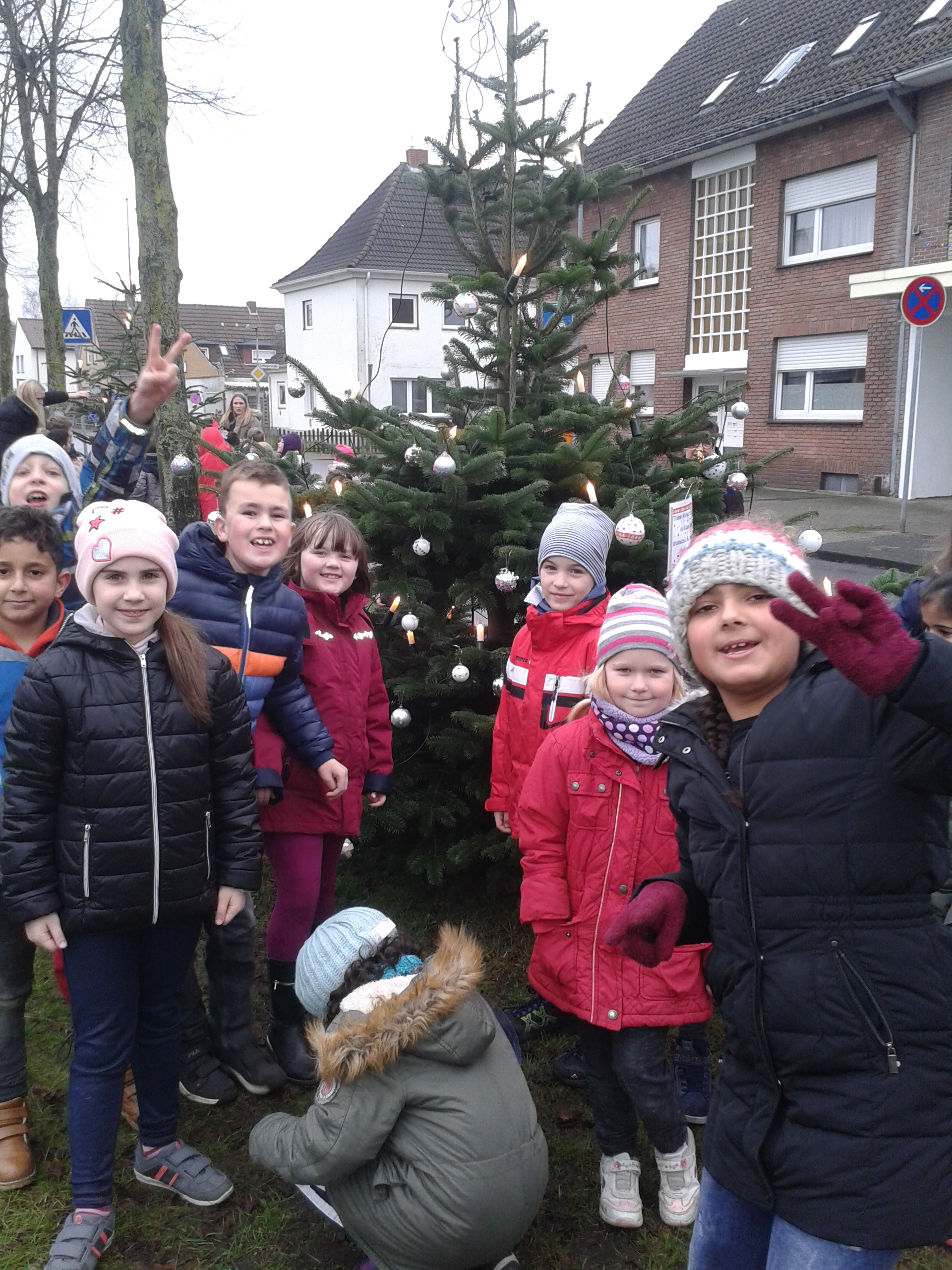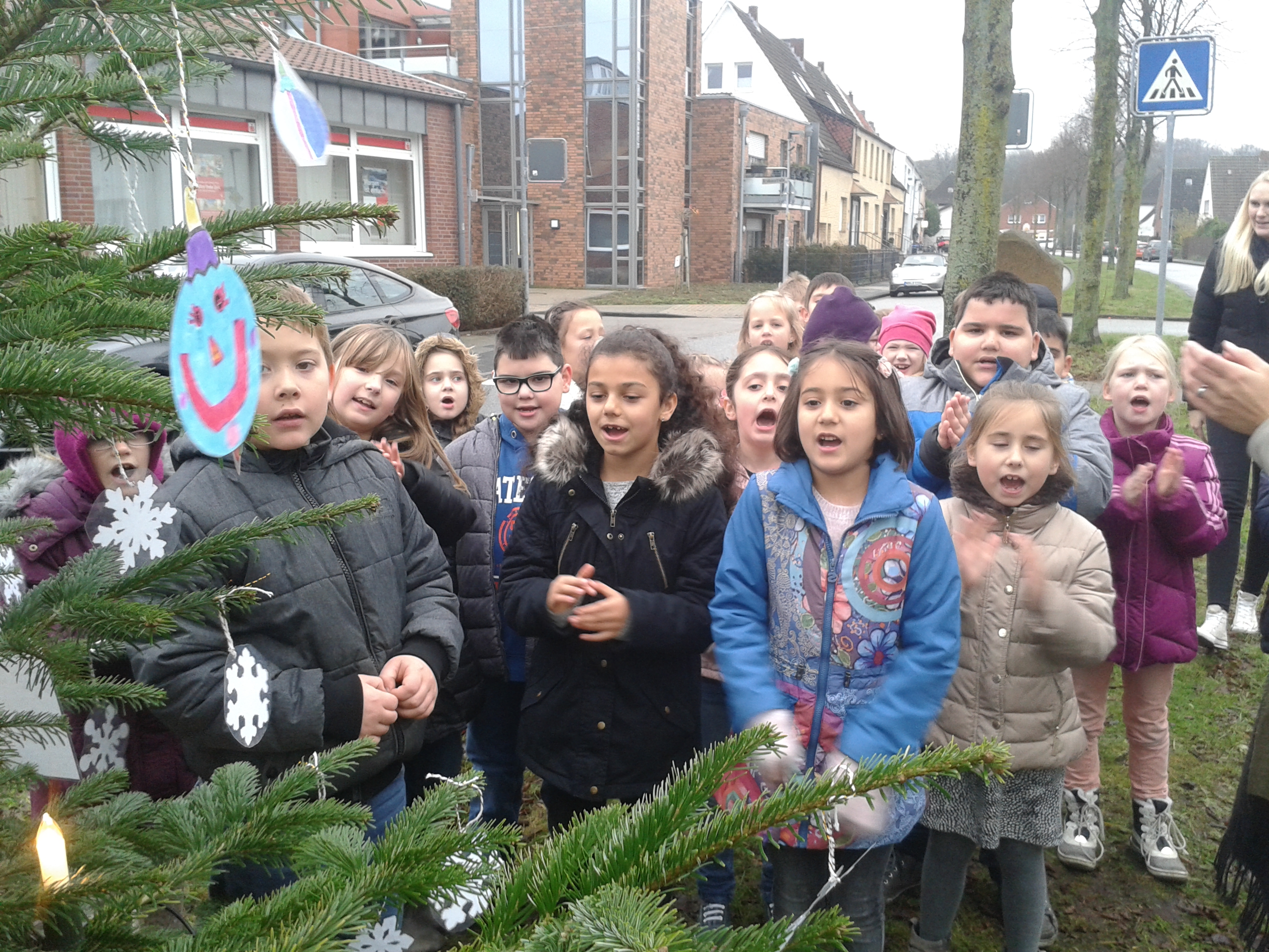 Am 5. Dezember sind die zweiten Klassen wie in jedem Jahr zur Lindenallee spaziert und haben dort jeweils einen Weihnachtsbaum geschmückt. Sehr schön sahen die Bäume aus – mit Kugeln und Schneeflocken. Zum Abschluss sangen wir gemeinsam noch das Lied „Lasst uns froh und munter sein“. Das passte gut, da ja am Abend der Nikolaus über die Lindenallee gefahren ist, und dort bestimmt die tollen Bäume gesehen hat. Vielen Dank an Herrn Sprinkmeyer und das Team von der Lindenapotheke für die Hilfe beim Schmücken und die kleine Aufmerksamkeit, die alle Kinder als Dankeschön bekommen haben.