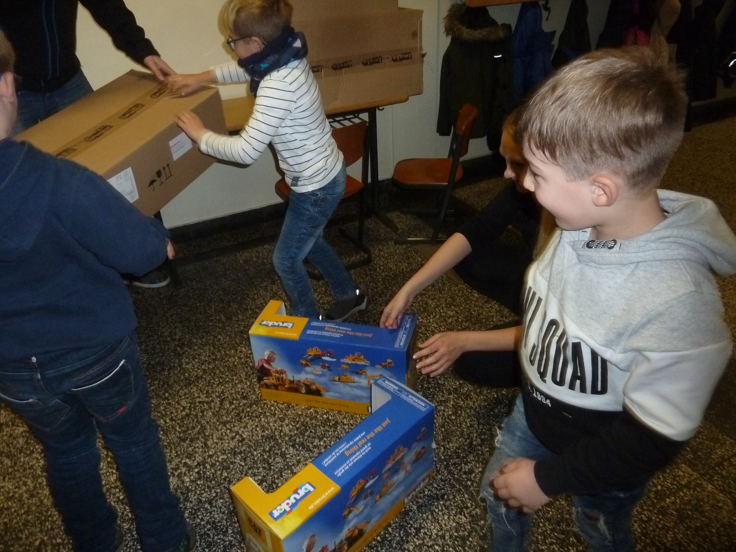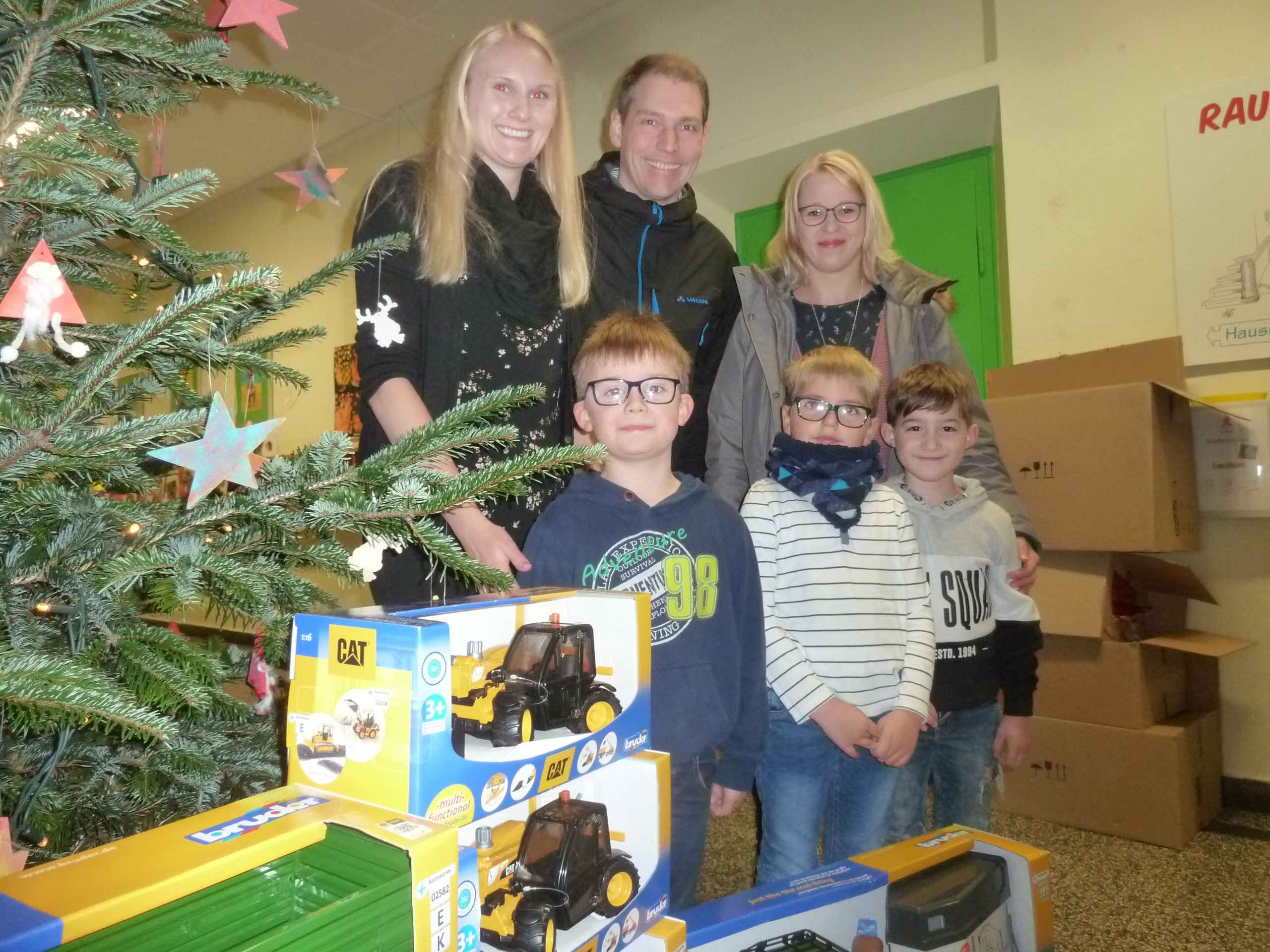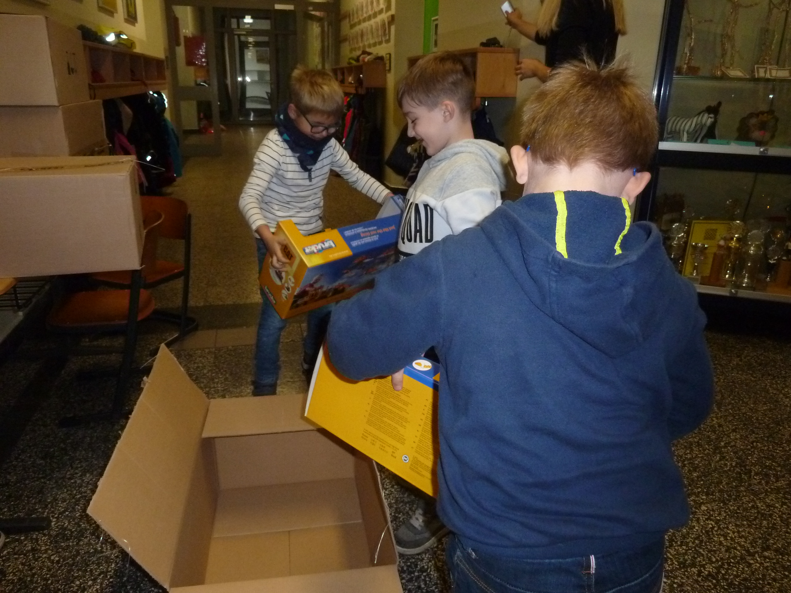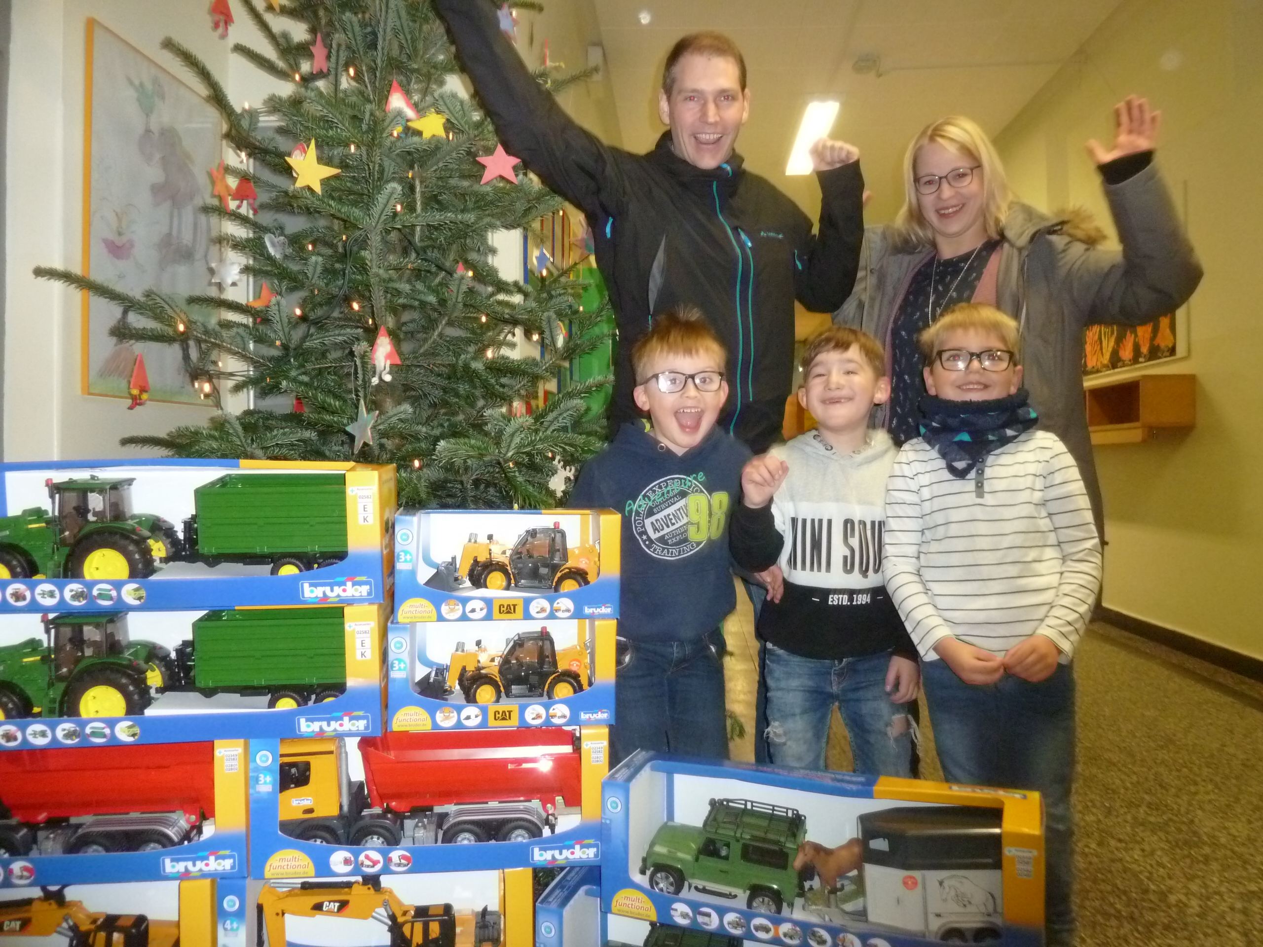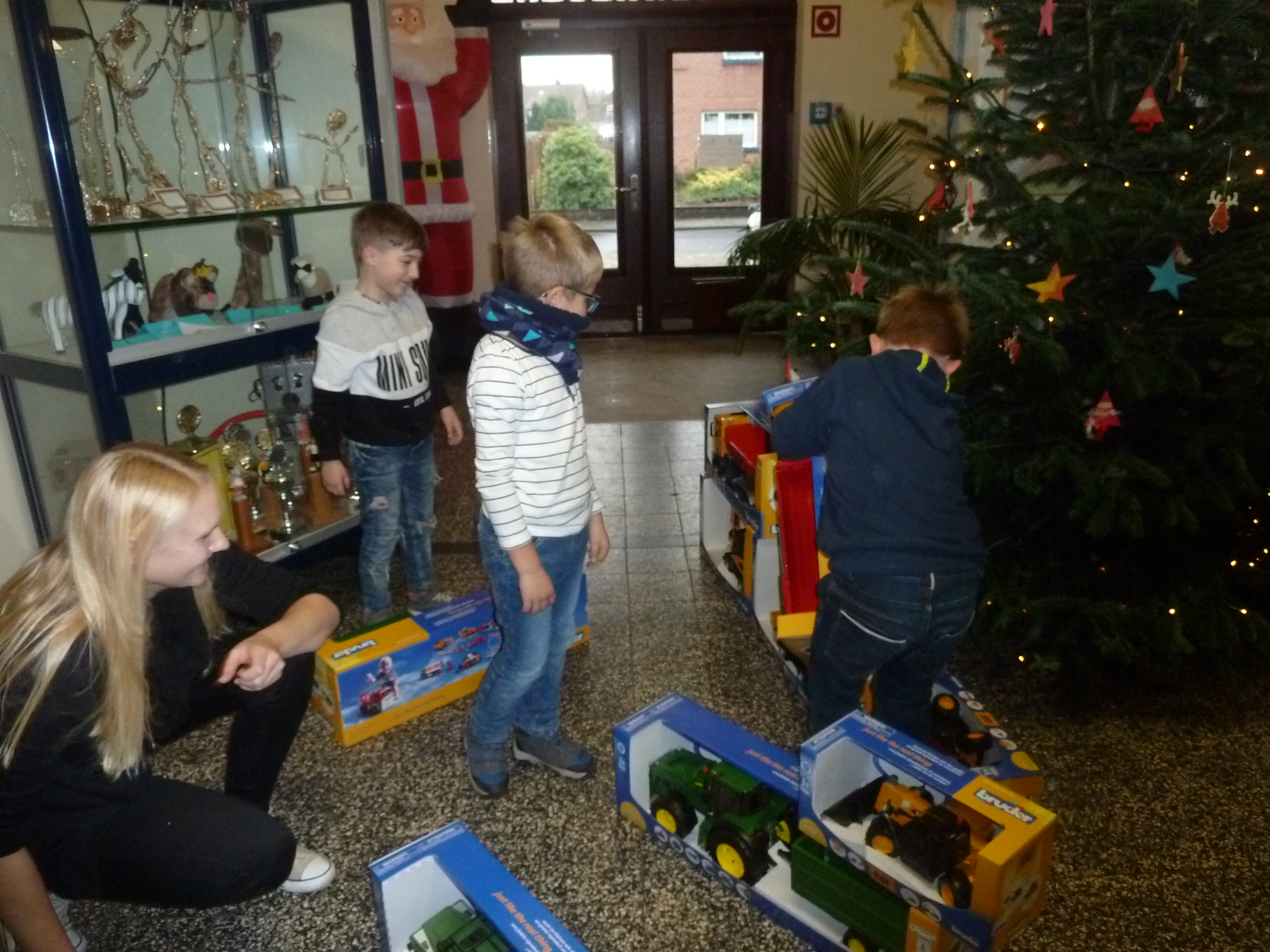 Mit großer Freude und Begeisterung wurde der Gewinn von drei Schülern vor dem Weihnachtsbaum ausgepackt,  bestaunt und direkt bespielt.