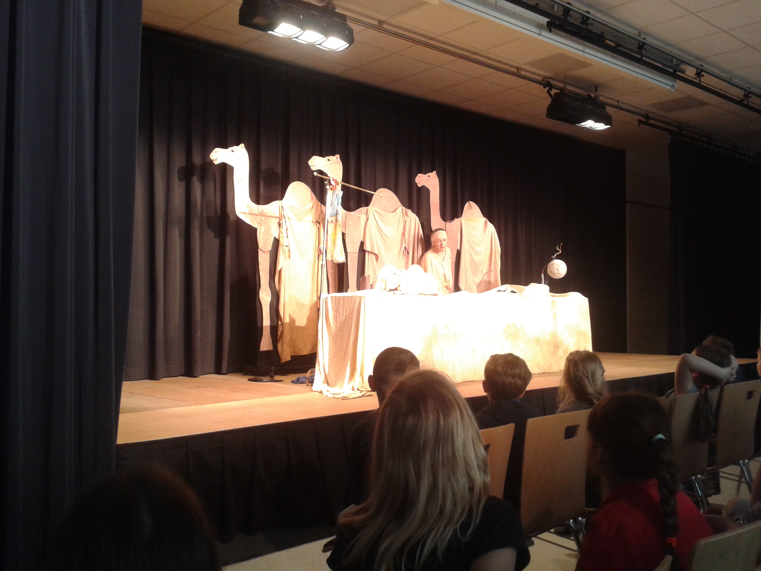 „Das fliegende Kamel“ – so hieß es am 23.4. für unsere ersten und zweiten Klassen. Wir besuchten eine Aufführung des Theater Jaro und verfolgten gespannt die Geschichte vom kleinen Kamel Fatma, das seine Herde verloren hat und auf seiner Suche tolle Sachen erlebt – ja, am Ende sogar fliegt. Ein beeindruckendes Bühnenbild und eine tolle schauspielerische Leistung begeisterten die Kinder.