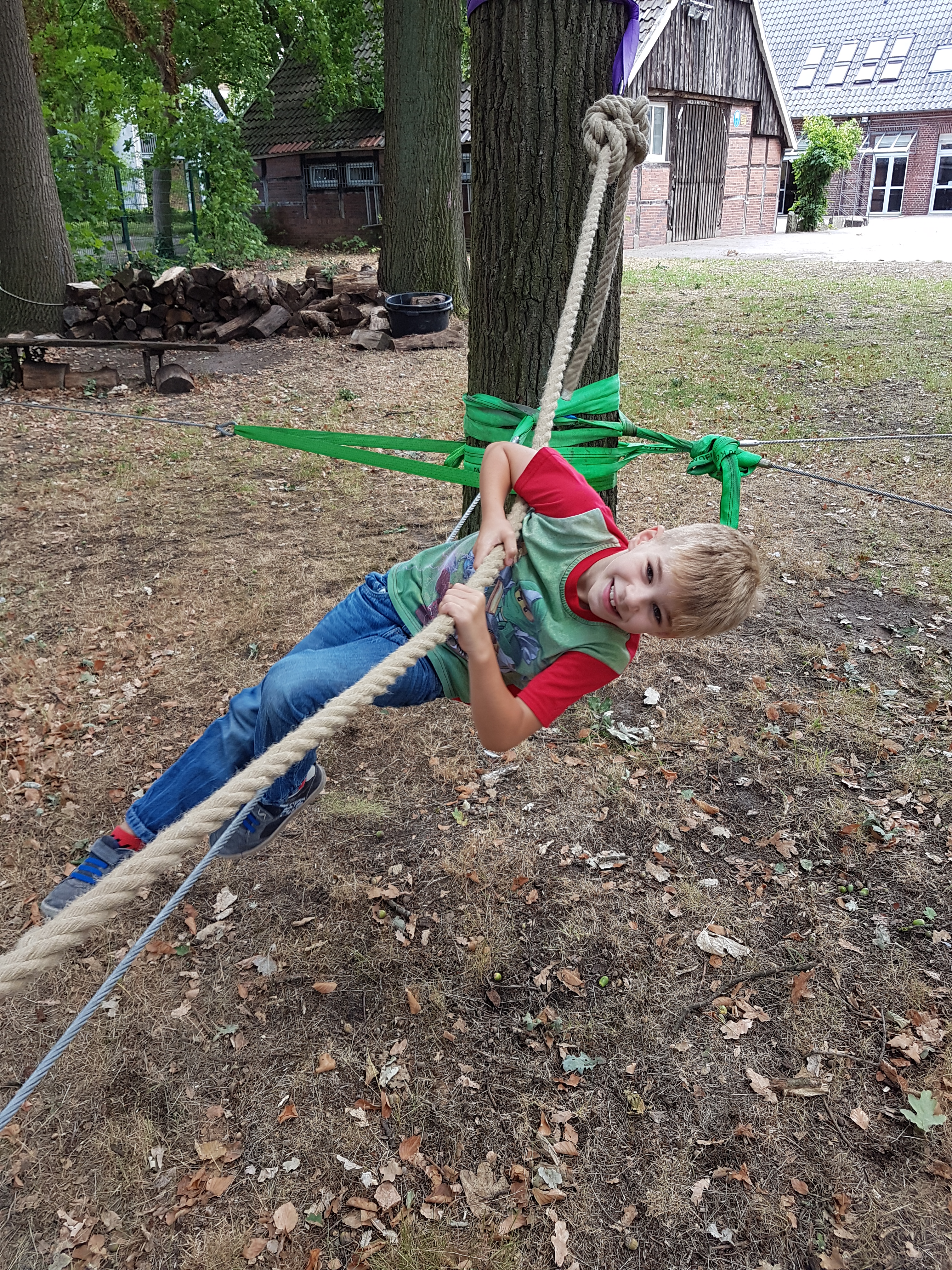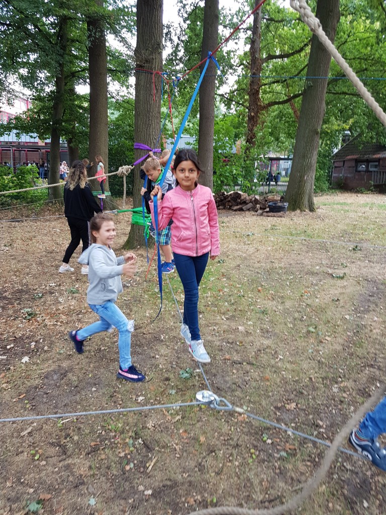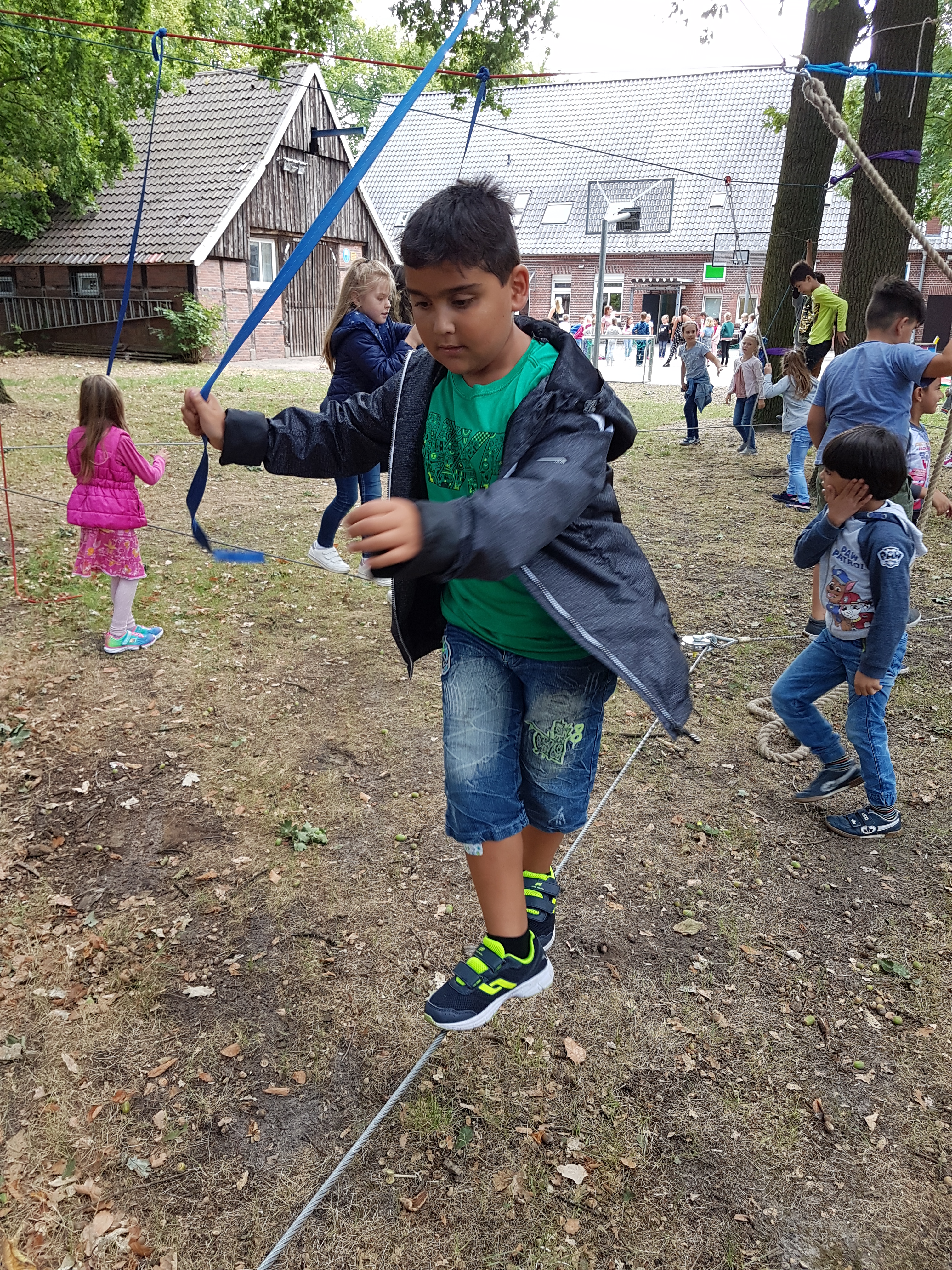 Am Montag, dem 13.8., durften unsere Drittklässlerinnen und Drittklässler einen besonderen Ausflug machen. Gemeinsam sind wir zum Jugendzentrum gelaufen. Dort war ein Niedrigseilgarten aufgebaut, auf dem alle Kinder balancieren durften.