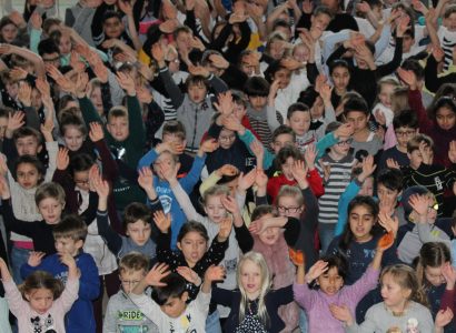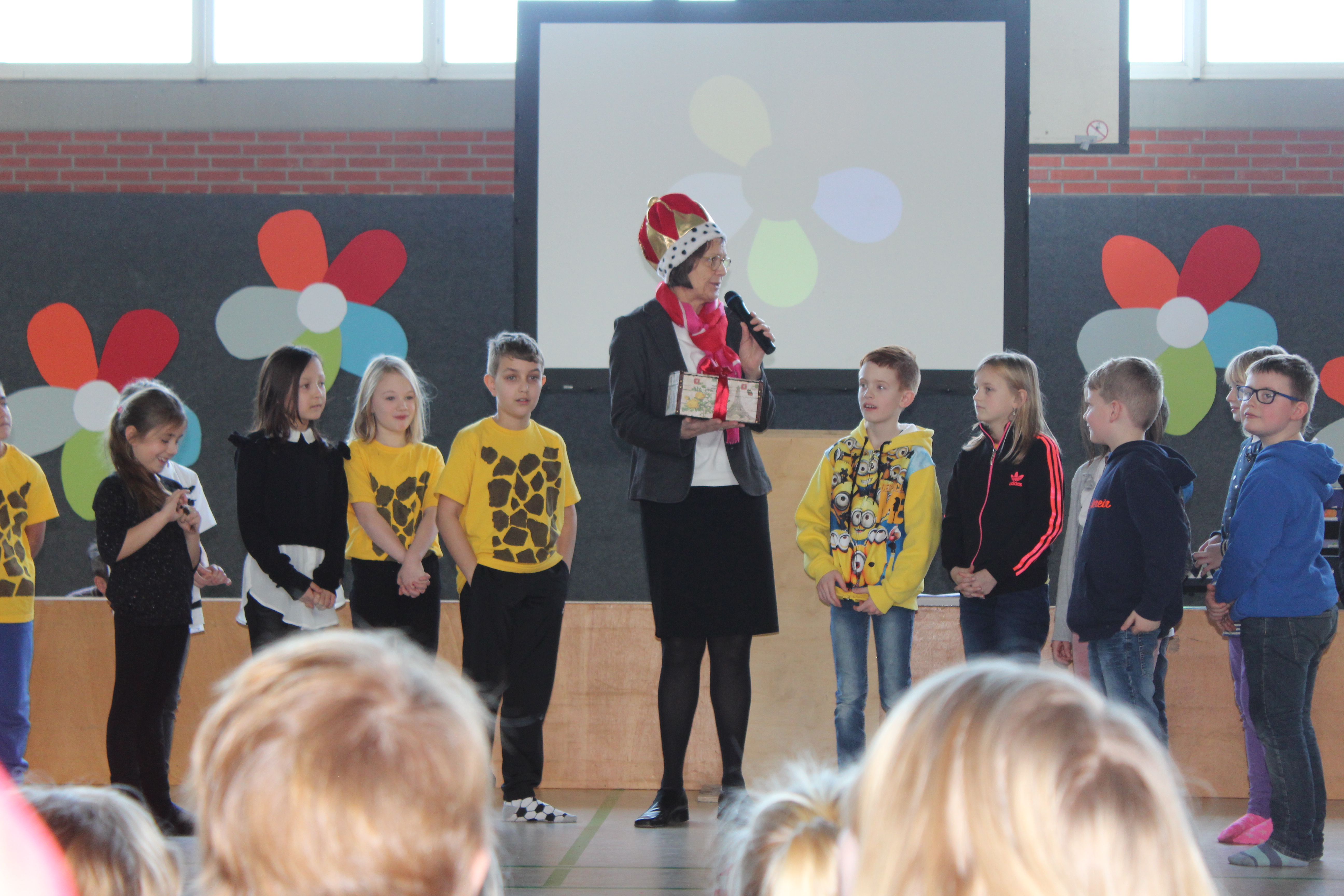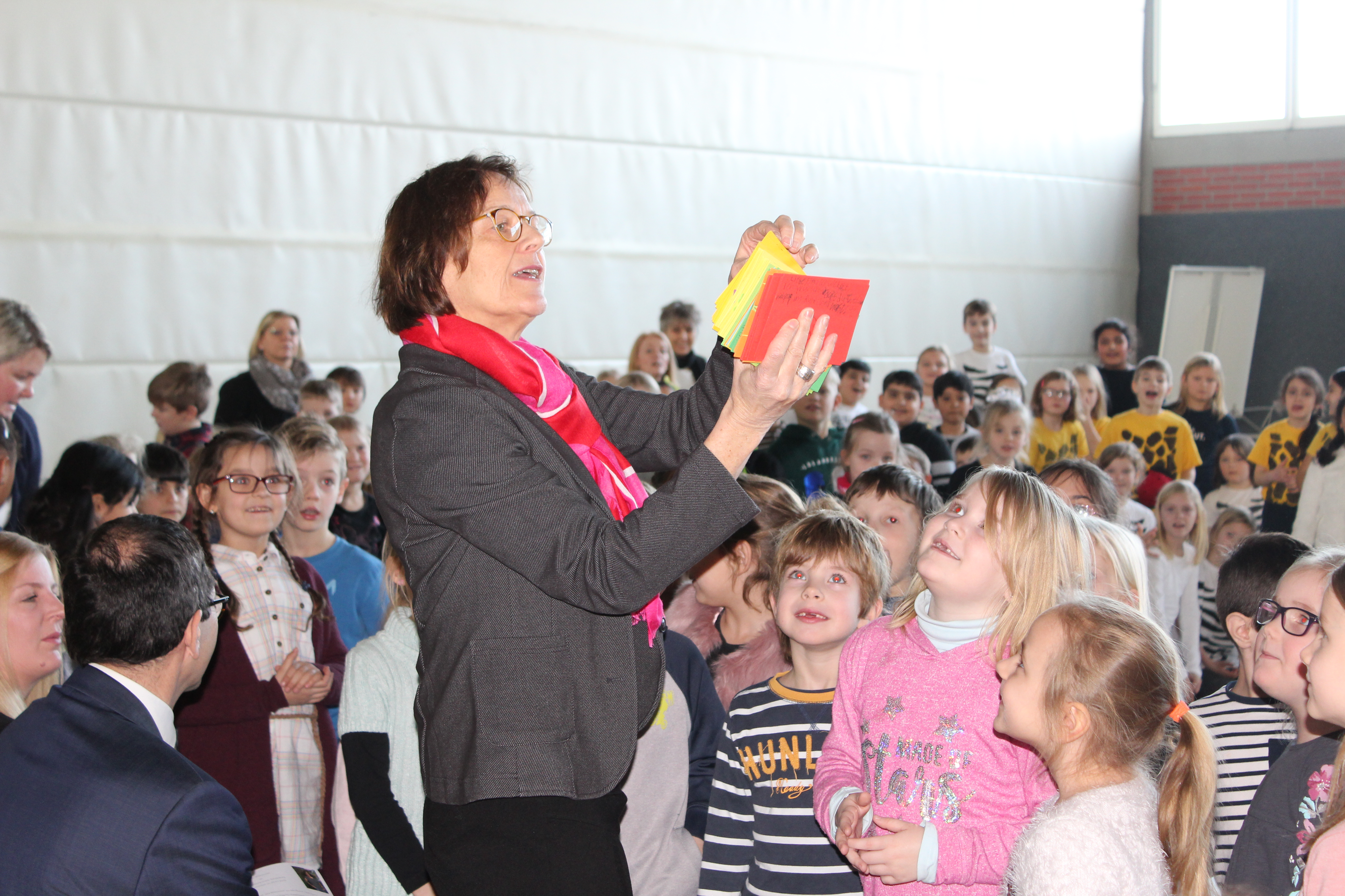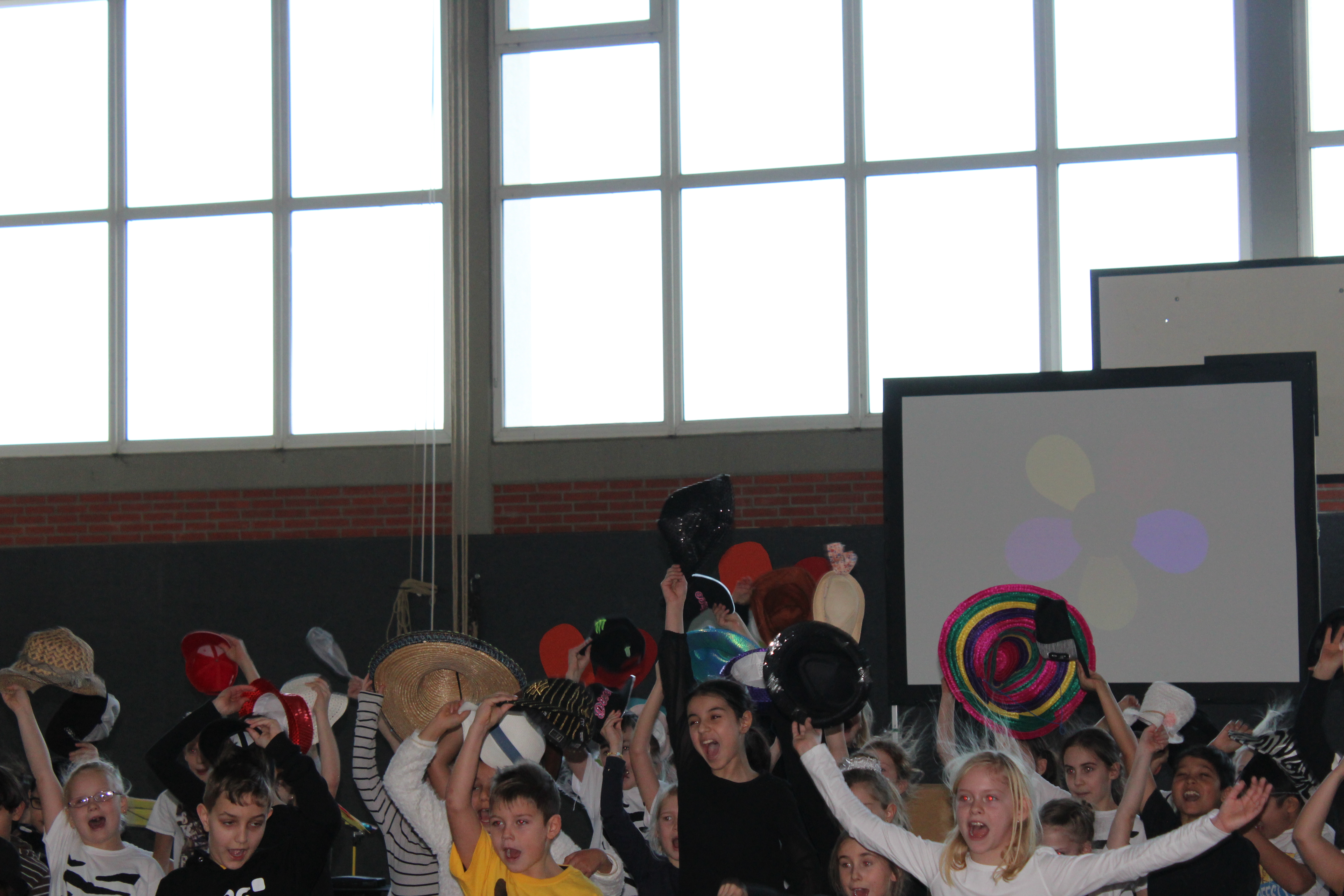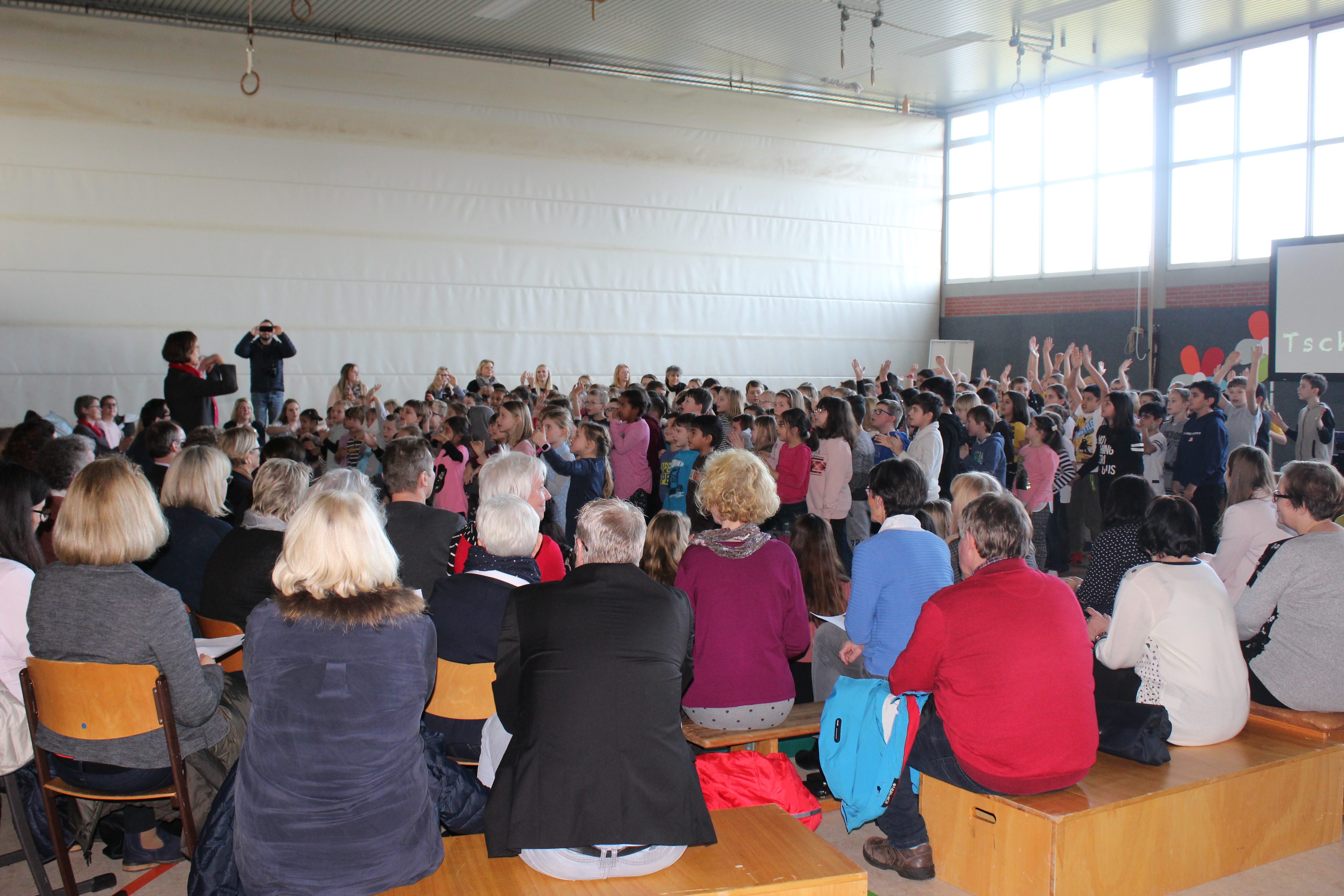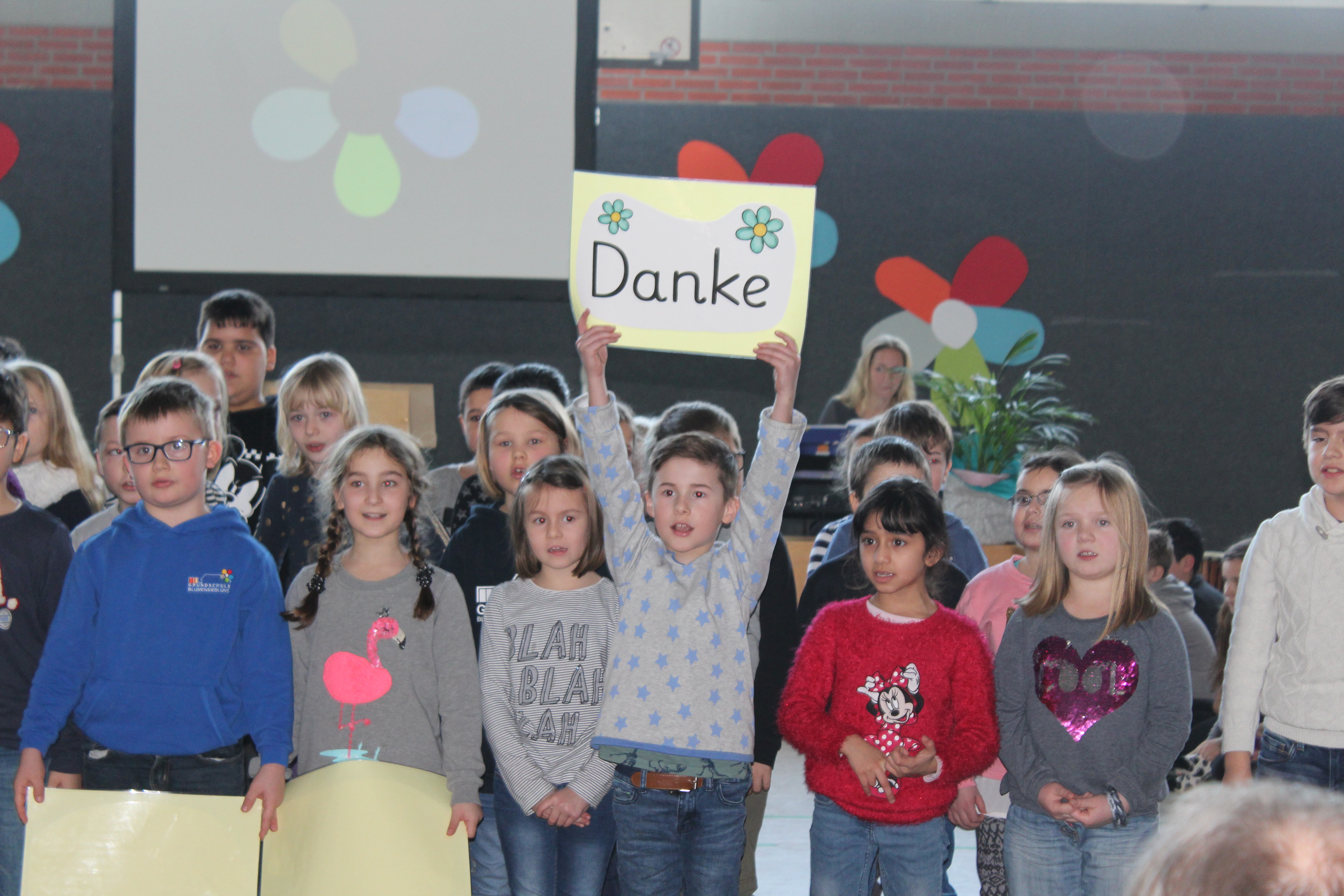 Die dritten Klassen sangen und tanzten „Hut ab!“ vor Frau Schwickerts Einsatz für die Schule.