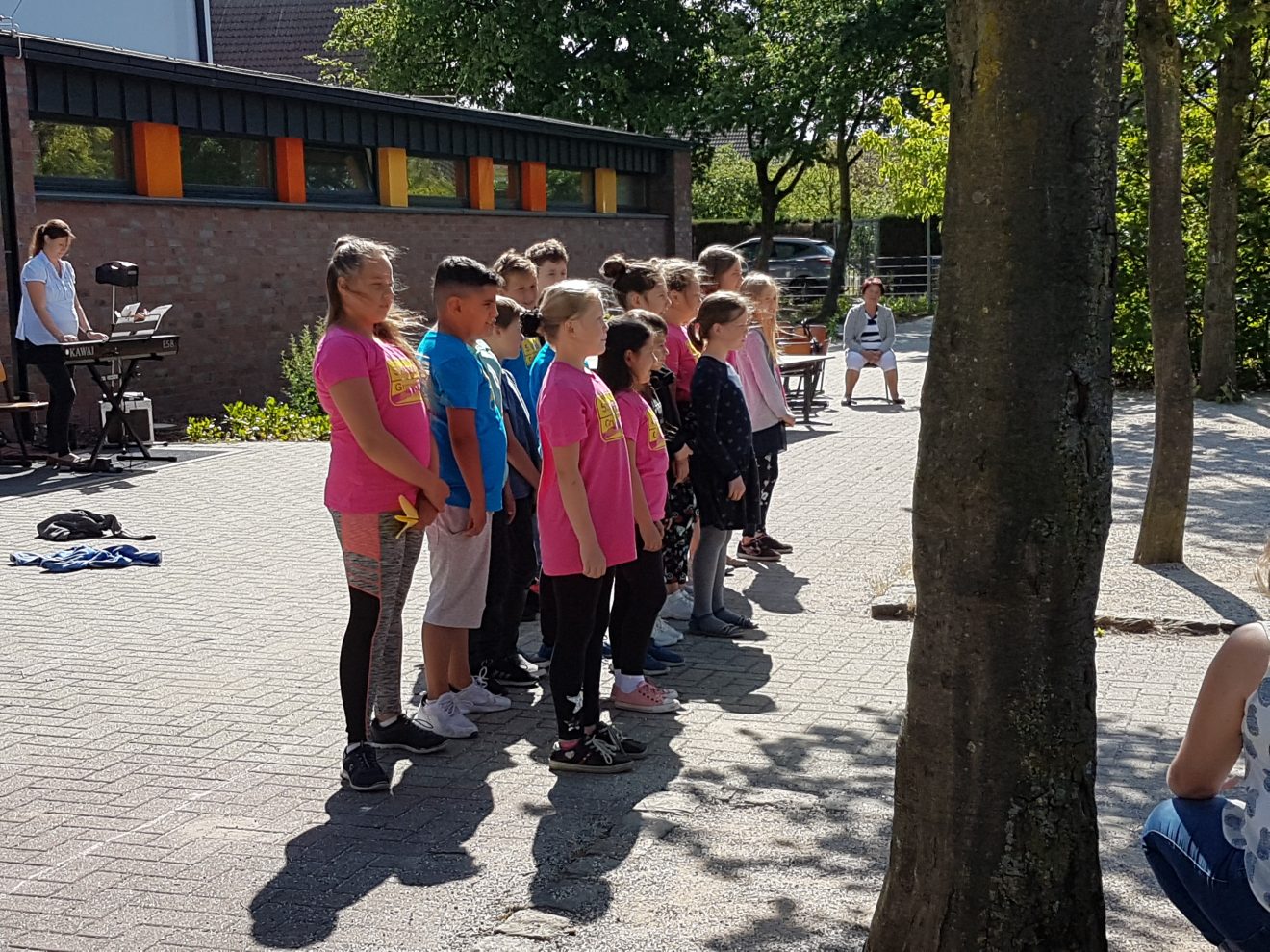 Endlich war der letzte Schultag des Schuljahres 2018/2019 gekommen. Alle freuten sich auf die Ferien. Aber unsere Viertklässler sahen diesem letzten Schultag an der Grundschule Blumensiedlung wohl mit etwas gemischten Gefühlen entgegen, so aufregend ist doch das, was da im nächsten Schuljahr an der weiterführenden Schule noch kommt. Mit tollen T-Shirts erwarteten sie, was ihre Mitschüler und sie selbst für ihren letzten Tag vorbereitet haben.