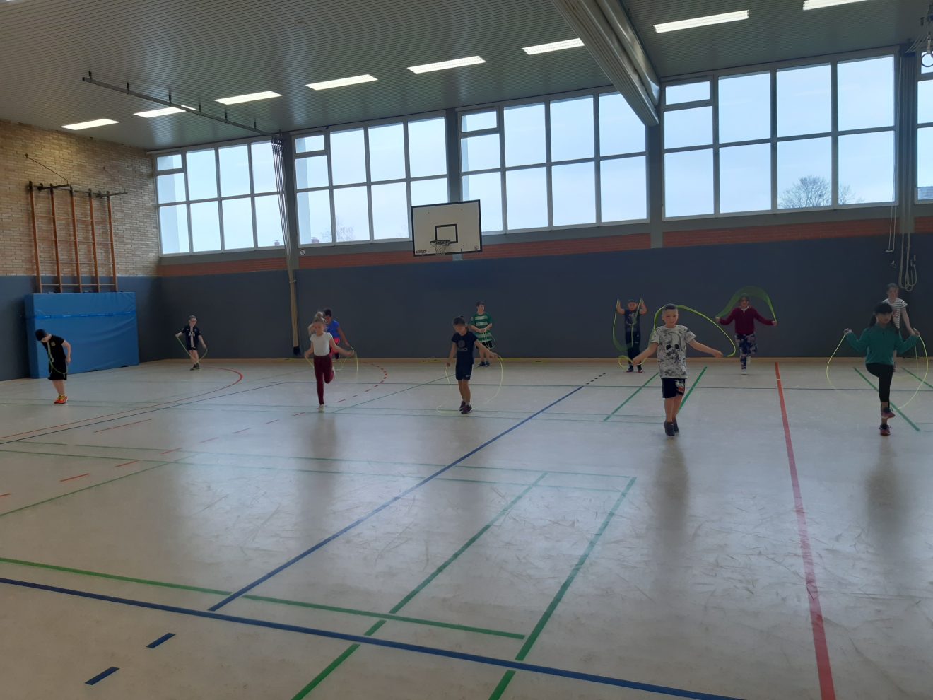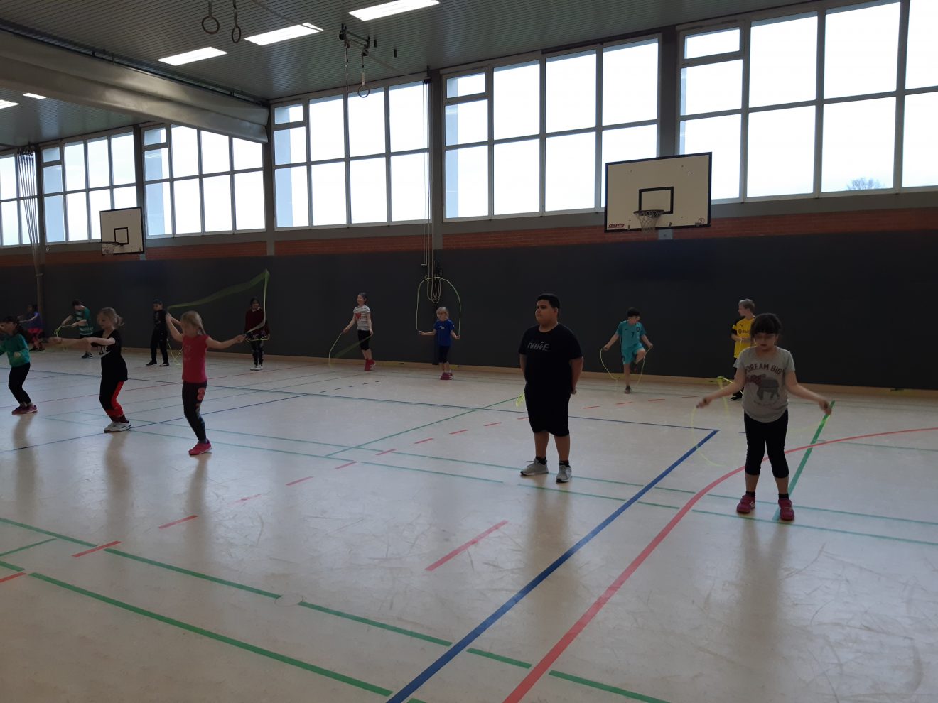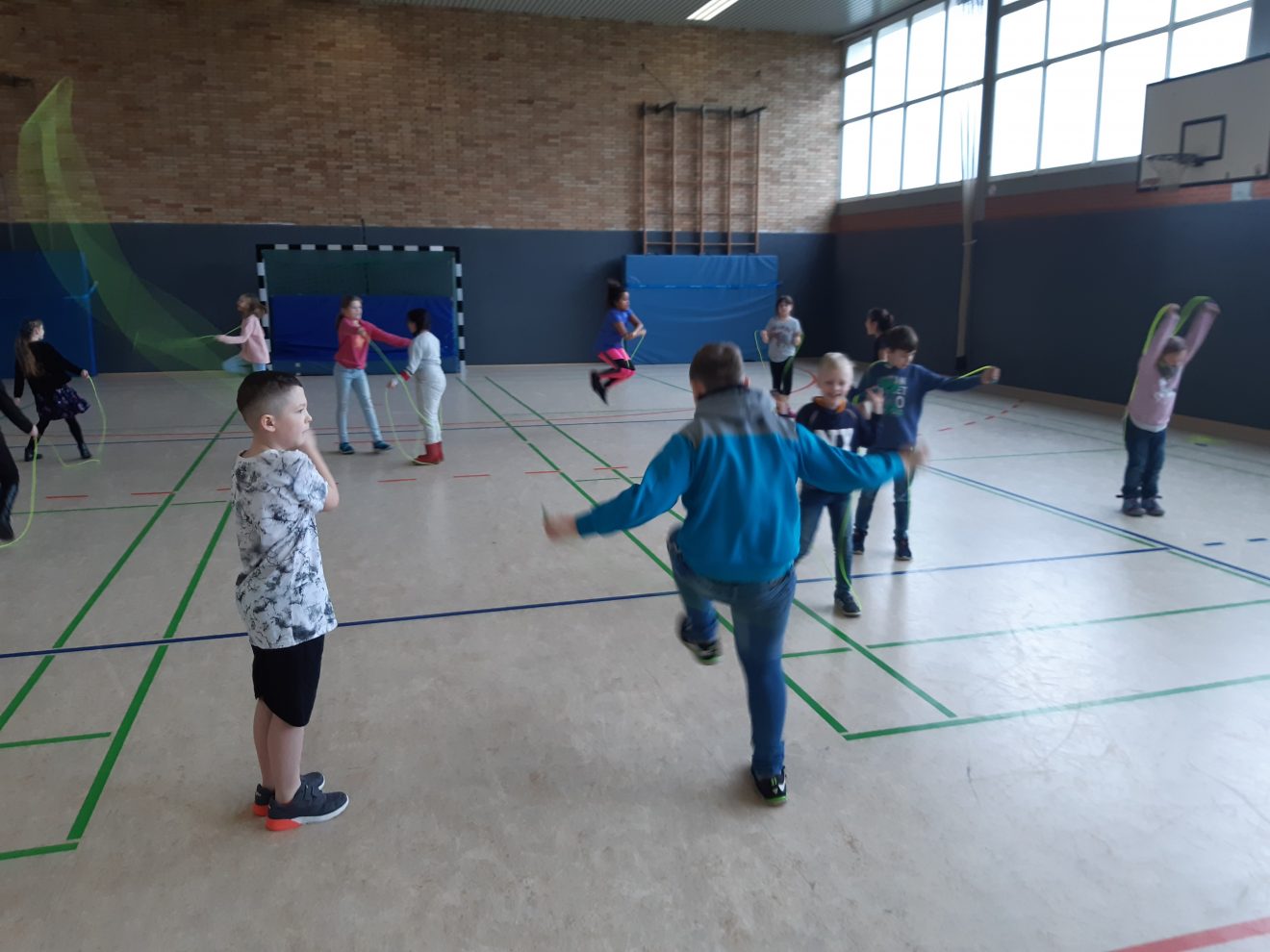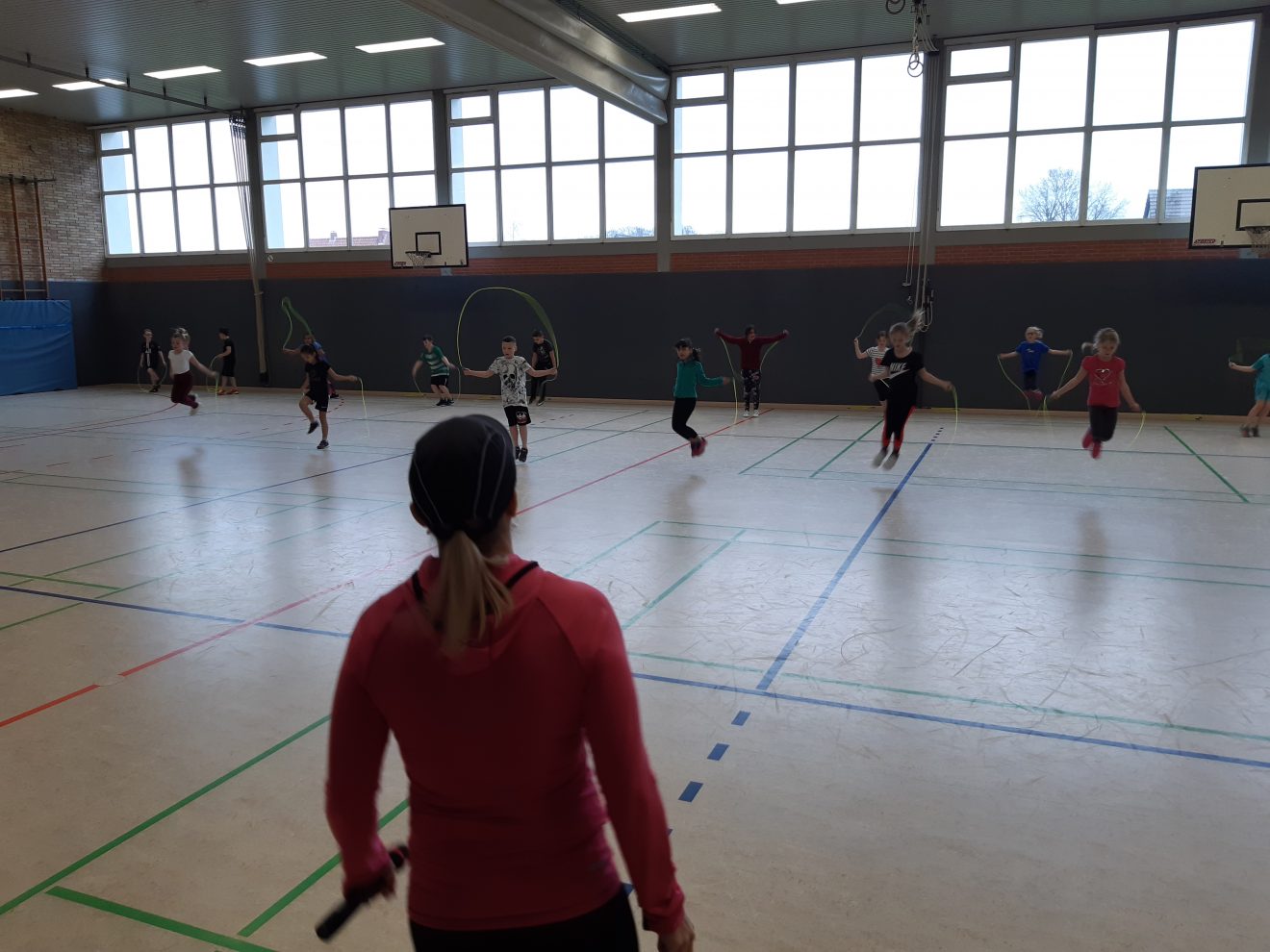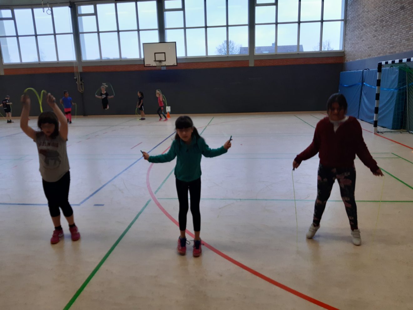 Durch Losentscheid hatte in diesem Jahr die Klasse 3b die Chance, an dem kostenfreien zweistündigen Basis-Kurs das sportliche Seilspringen vermittelt zu bekommen. Der durch Frau Schultjan angeleitete Workshop enthielt zahlreiche Sprungvariationen, die allein, zu zweit oder in der Gruppe durchgeführt werden konnten.