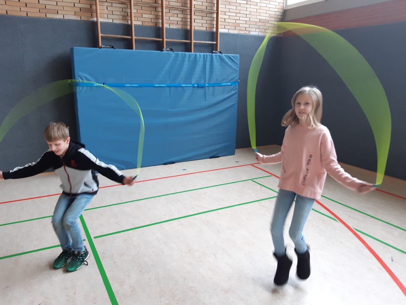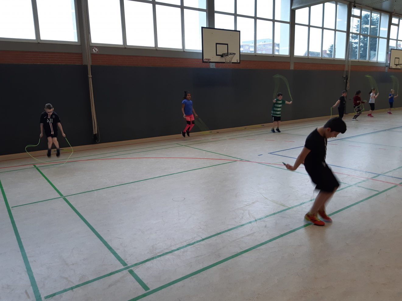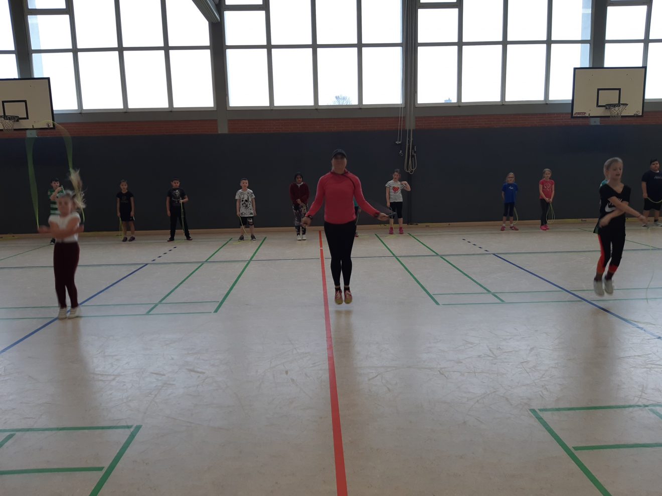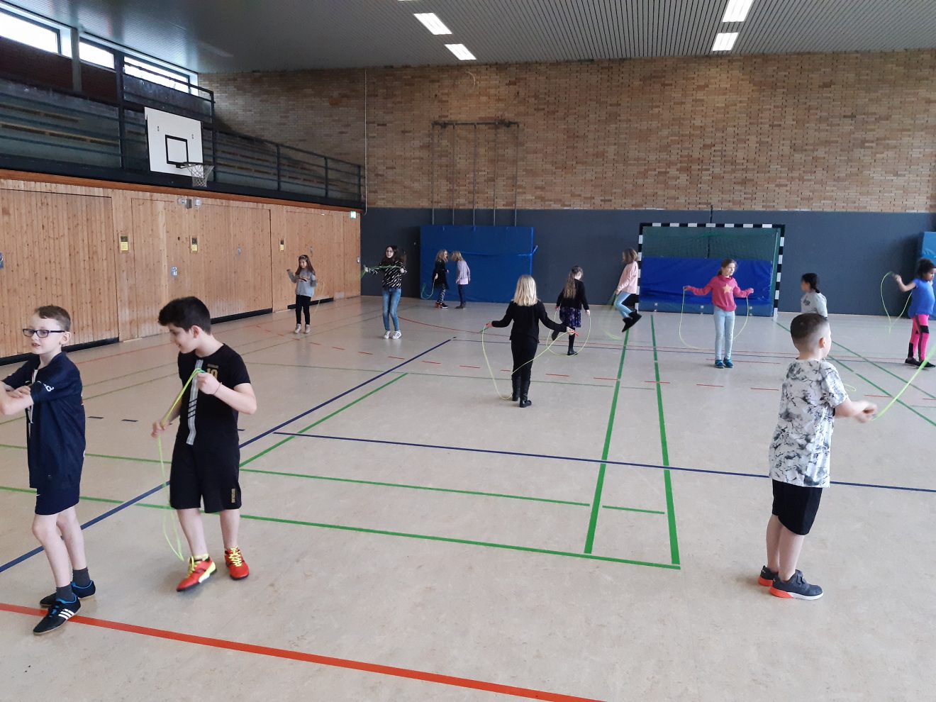 Durch Losentscheid hatte in diesem Jahr die Klasse 3b die Chance, an dem kostenfreien zweistündigen Basis-Kurs das sportliche Seilspringen vermittelt zu bekommen. Der durch Frau Schultjan angeleitete Workshop enthielt zahlreiche Sprungvariationen, die allein, zu zweit oder in der Gruppe durchgeführt werden konnten.