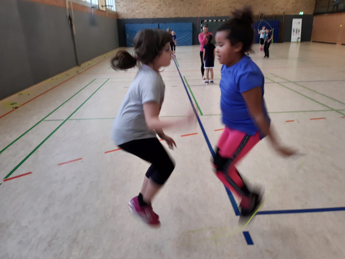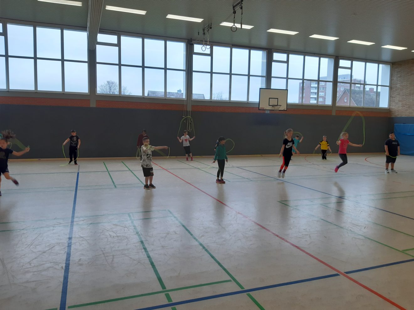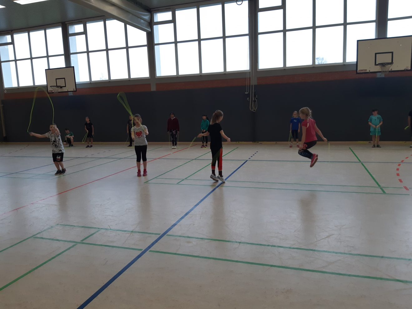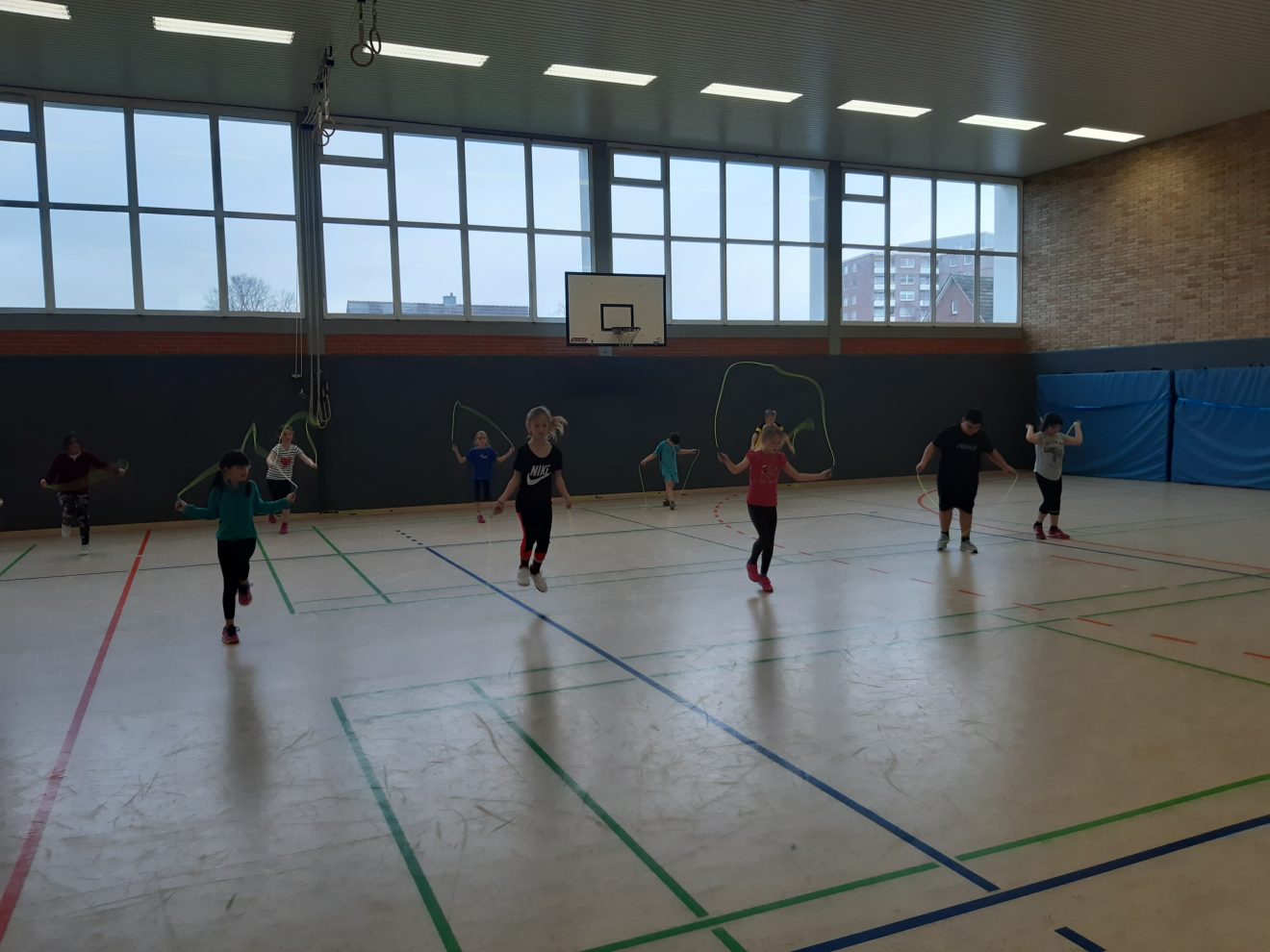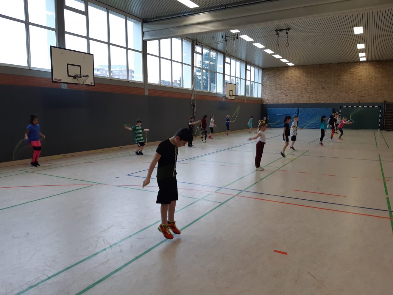 Durch Losentscheid hatte in diesem Jahr die Klasse 3b die Chance, an dem kostenfreien zweistündigen Basis-Kurs das sportliche Seilspringen vermittelt zu bekommen. Der durch Frau Schultjan angeleitete Workshop enthielt zahlreiche Sprungvariationen, die allein, zu zweit oder in der Gruppe durchgeführt werden konnten.