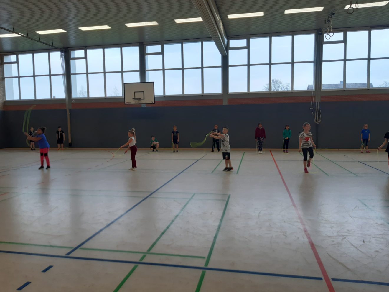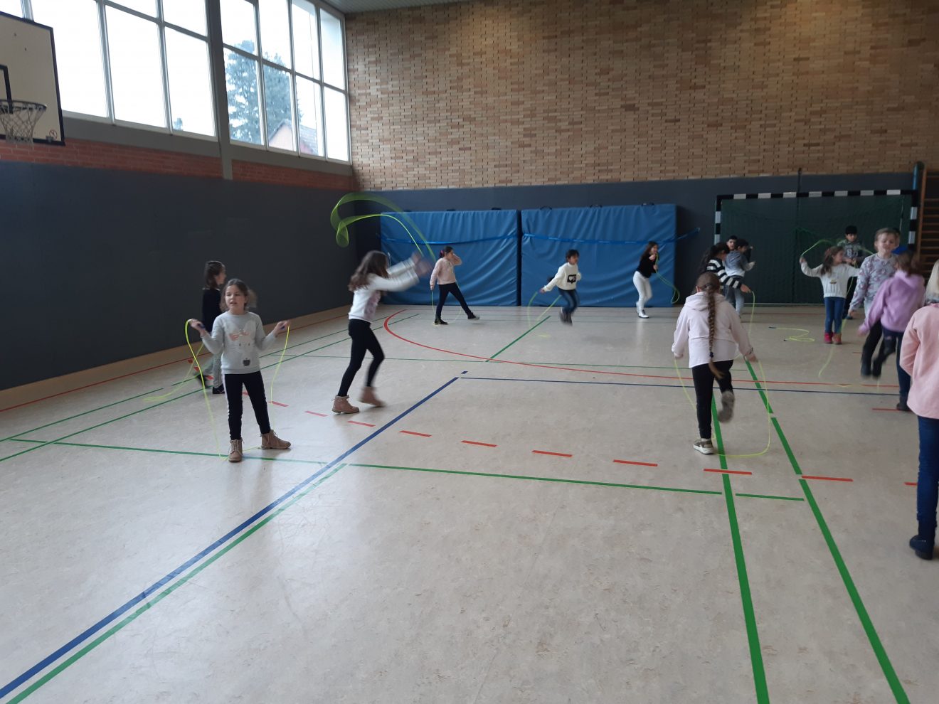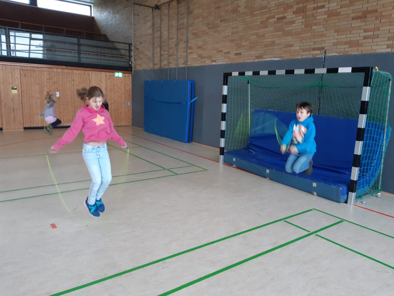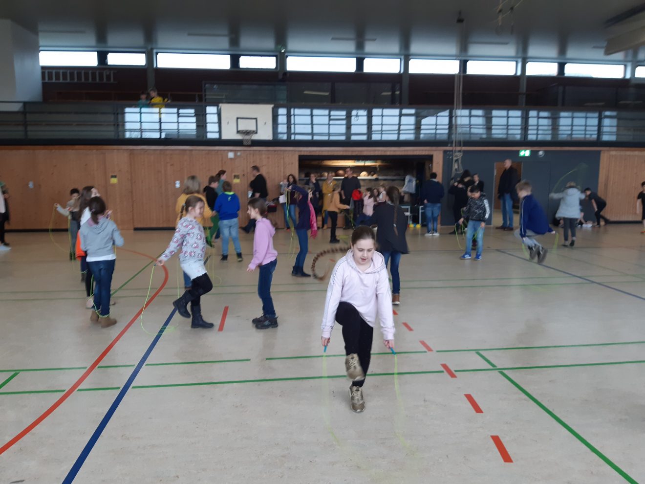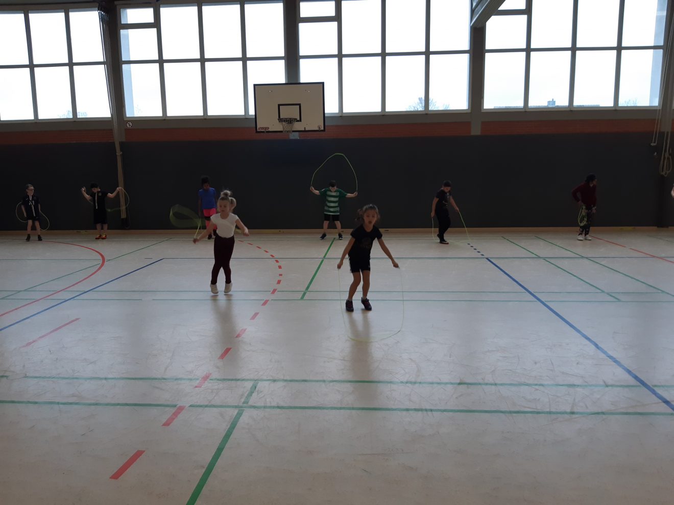 Durch Losentscheid hatte in diesem Jahr die Klasse 3b die Chance, an dem kostenfreien zweistündigen Basis-Kurs das sportliche Seilspringen vermittelt zu bekommen. Der durch Frau Schultjan angeleitete Workshop enthielt zahlreiche Sprungvariationen, die allein, zu zweit oder in der Gruppe durchgeführt werden konnten.