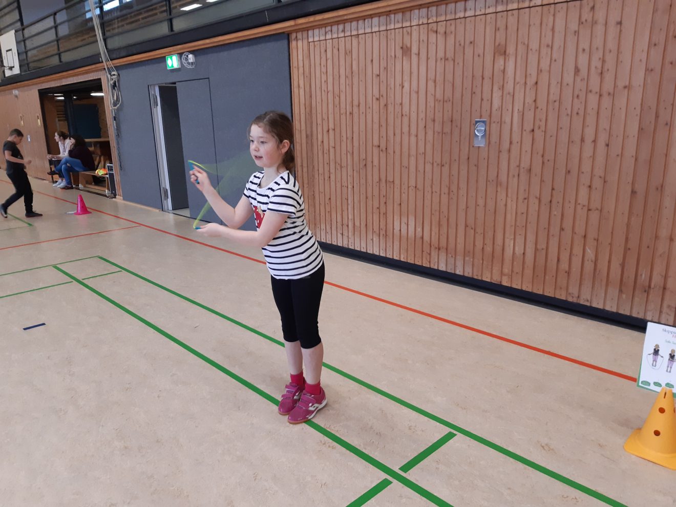 Im direkten Anschluss an den Workshop stellten die Kinder in einer gut 15minütigen Aufführung unter Beweis, was sie alles in der kurzen Zeit gelernt haben. Die Dritt- und Viertklässler sowie Eltern hatten abschließend noch die Gelegenheit, selbst das Seil in die Hand zu nehmen und die verschiedenen Sprünge auszuprobieren.