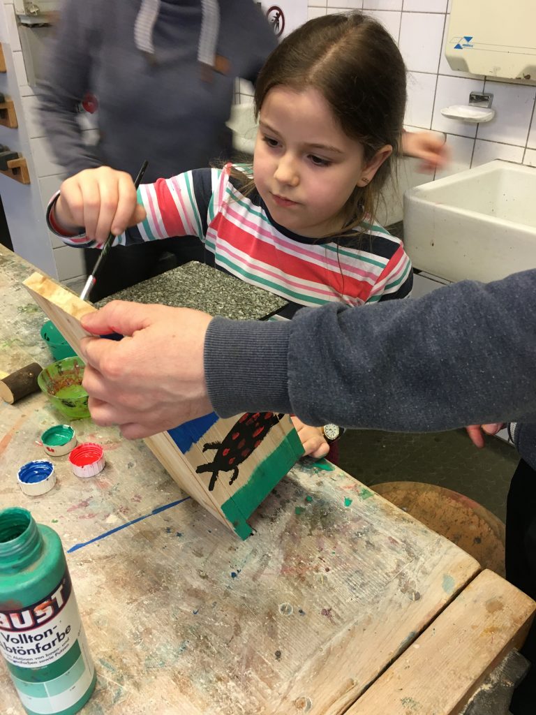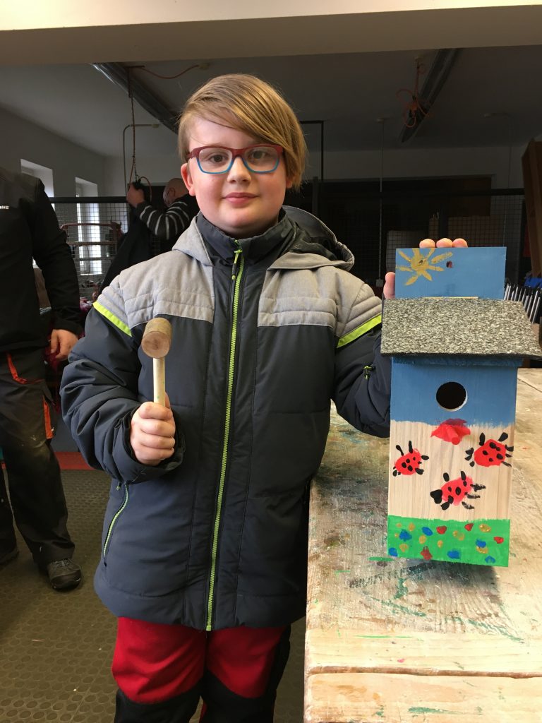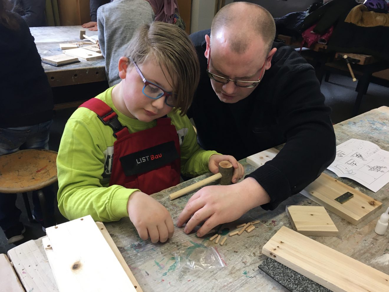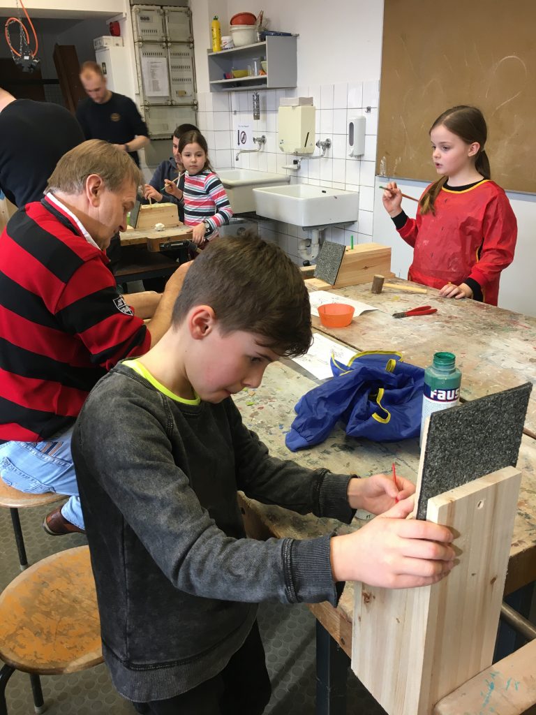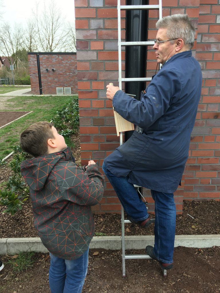 Am 28. Februar 2020 haben 12 Kinder aus unseren 3. Klassen gemeinsam mit ihren Vätern oder Großvätern an unserem Nistkasten-Projekt teilgenommen. Im Werkraum wurde gemeinsam gebaut, gehämmert und gemalt. Schulsozialarbeiterin Daniela Wolf konnte die Jäger der Jägerschaft vom Hegering 3 aus Nordhorn für dieses Projekt gewinnen. Drei Jägerinnen und Jäger waren an dem Nachmittag ehrenamtlich dabei und unterstützten die Kinder, Väter und Großväter tatkräftig. Jäger Hans Kramer gab außerdem viele interessante Hintergrundinformationen. Er erklärte zum Beispiel, in welche Himmelsrichtung die Nistkästen ausgerichtet werden sollten oder warum der Eingang zu den Nistkästen so klein ist. Auch unser ehemaliger Schulhausmeister nahm gemeinsam mit seiner Enkeltochter an dem Projekt teil. Beim Aufhängen der Nistkästen packte er fleißig mit an. Zum Schluss konnten 12 tolle Nistkästen für Meisen auf dem Schulhof und rund um unsere Schule aufgehängt werden. Diese Nistkästen sehen nicht nur schön aus, sondern laden hoffentlich im Frühling viele Meisen dazu ein, rund um unsere Schule zu nisten. Vielleicht tragen diese dann einen Teil dazu bei, dass es weniger Eichenprozessionsspinner gibt, indem sie zahlreiche Larven auffressen. Ein herzliches Dankeschön an die Jägerschaft vom Hegering 3 für die tatkräftige Unterstützung bei diesem Projekt und an die Abteilung Jugendarbeit der Stadt Nordhorn für die finanzielle Unterstützung!