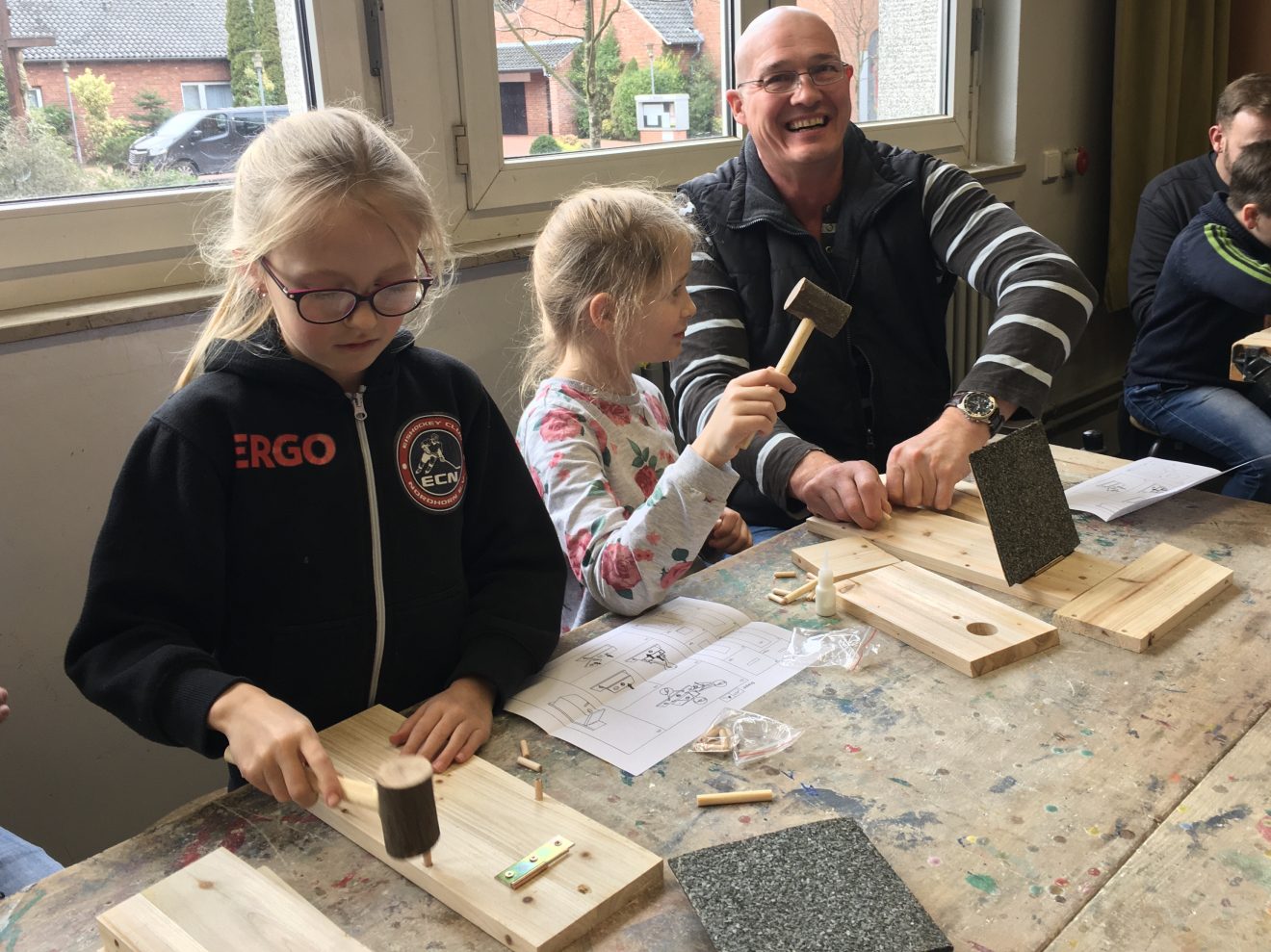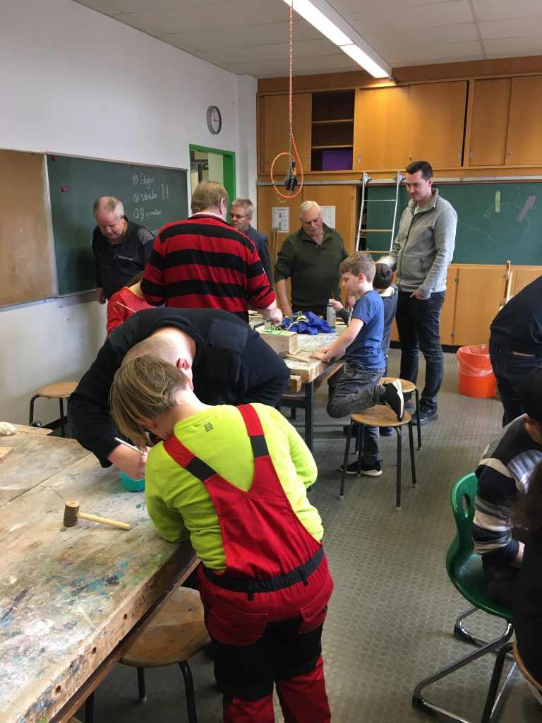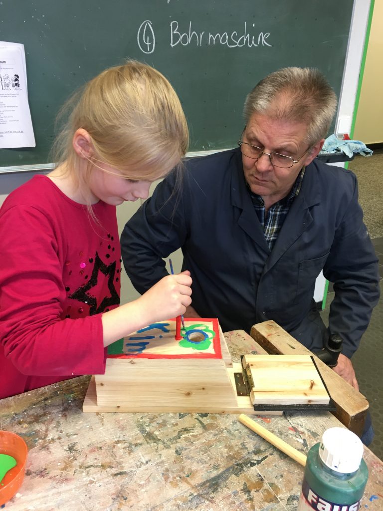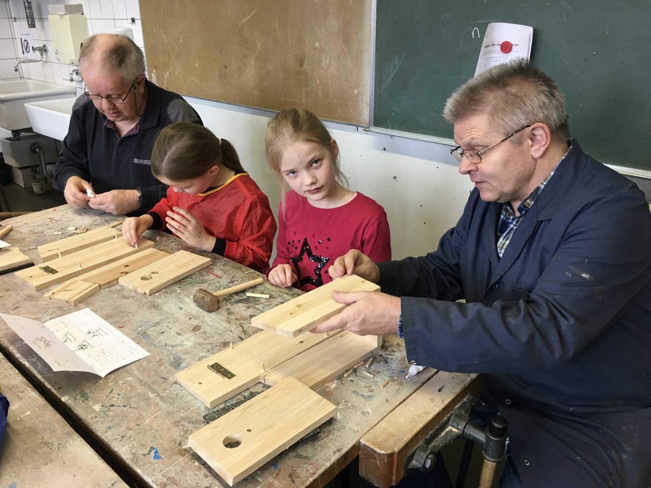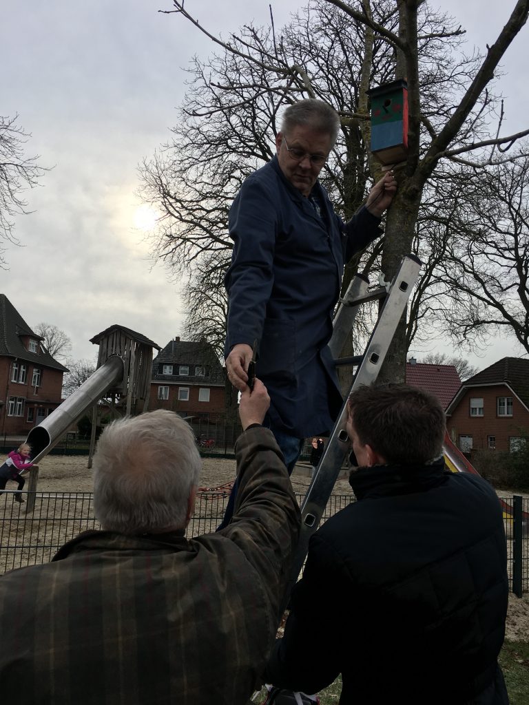 Am 28. Februar 2020 haben 12 Kinder aus unseren 3. Klassen gemeinsam mit ihren Vätern oder Großvätern an unserem Nistkasten-Projekt teilgenommen. Im Werkraum wurde gemeinsam gebaut, gehämmert und gemalt. Schulsozialarbeiterin Daniela Wolf konnte die Jäger der Jägerschaft vom Hegering 3 aus Nordhorn für dieses Projekt gewinnen. Drei Jägerinnen und Jäger waren an dem Nachmittag ehrenamtlich dabei und unterstützten die Kinder, Väter und Großväter tatkräftig. Jäger Hans Kramer gab außerdem viele interessante Hintergrundinformationen. Er erklärte zum Beispiel, in welche Himmelsrichtung die Nistkästen ausgerichtet werden sollten oder warum der Eingang zu den Nistkästen so klein ist. Auch unser ehemaliger Schulhausmeister nahm gemeinsam mit seiner Enkeltochter an dem Projekt teil. Beim Aufhängen der Nistkästen packte er fleißig mit an. Zum Schluss konnten 12 tolle Nistkästen für Meisen auf dem Schulhof und rund um unsere Schule aufgehängt werden. Diese Nistkästen sehen nicht nur schön aus, sondern laden hoffentlich im Frühling viele Meisen dazu ein, rund um unsere Schule zu nisten. Vielleicht tragen diese dann einen Teil dazu bei, dass es weniger Eichenprozessionsspinner gibt, indem sie zahlreiche Larven auffressen. Ein herzliches Dankeschön an die Jägerschaft vom Hegering 3 für die tatkräftige Unterstützung bei diesem Projekt und an die Abteilung Jugendarbeit der Stadt Nordhorn für die finanzielle Unterstützung!