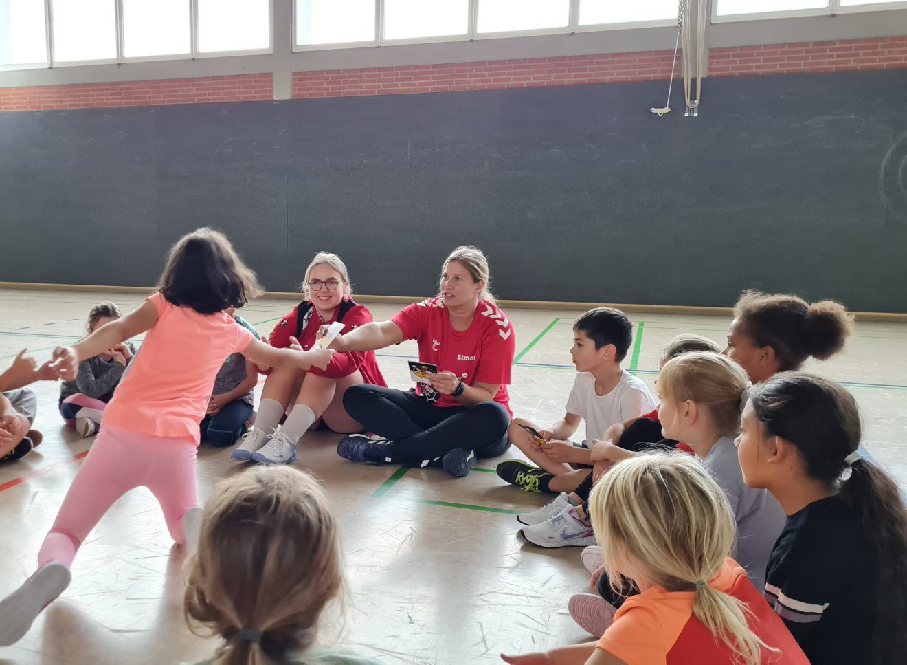 Am vergangenen Freitag hatten unsere dritten Klassen die Möglichkeit, in den Handballsport hineinzuschnuppern. Jede der dritten Klassen absolvierte dabei innerhalb einer Doppelstunde den „DHB Hanniballpass“, der verschiedene handballspezifische Stationen beinhaltet. Tatkräftig unterstützt wurden die Kinder vom Team des Tiga Junior Clubs (Simone & Uli) und dem Handballprofispieler Alexander Feld der HSG Nordhorn.