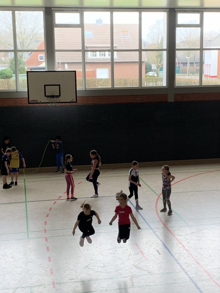 In der ersten Märzwoche standen viele tolle Sportveranstaltungen für verschiedene Jahrgänge unserer Schule auf dem Programm. Für 30 Drittklässler, die per Losentscheid aus den drei dritten Klassen ausgewählt wurden, hieß es am Mittwoch, dem 06.03.2024: „Ran ans Seil und Springen wie die Weltmeister!“ Dabei wurden die Kinder in einem dreistündigen Workshop an verschiedene Seilsprungübungen herangeführt, die sie sowohl allein, zu zweit als auch mit der gesamten Gruppe durchführten. Zum Abschluss entstand eine tolle kurze Seilsprungpräsentation, die stolz einem Publikum aus Eltern, Zweit- und Drittklässlern dargeboten werden konnte.