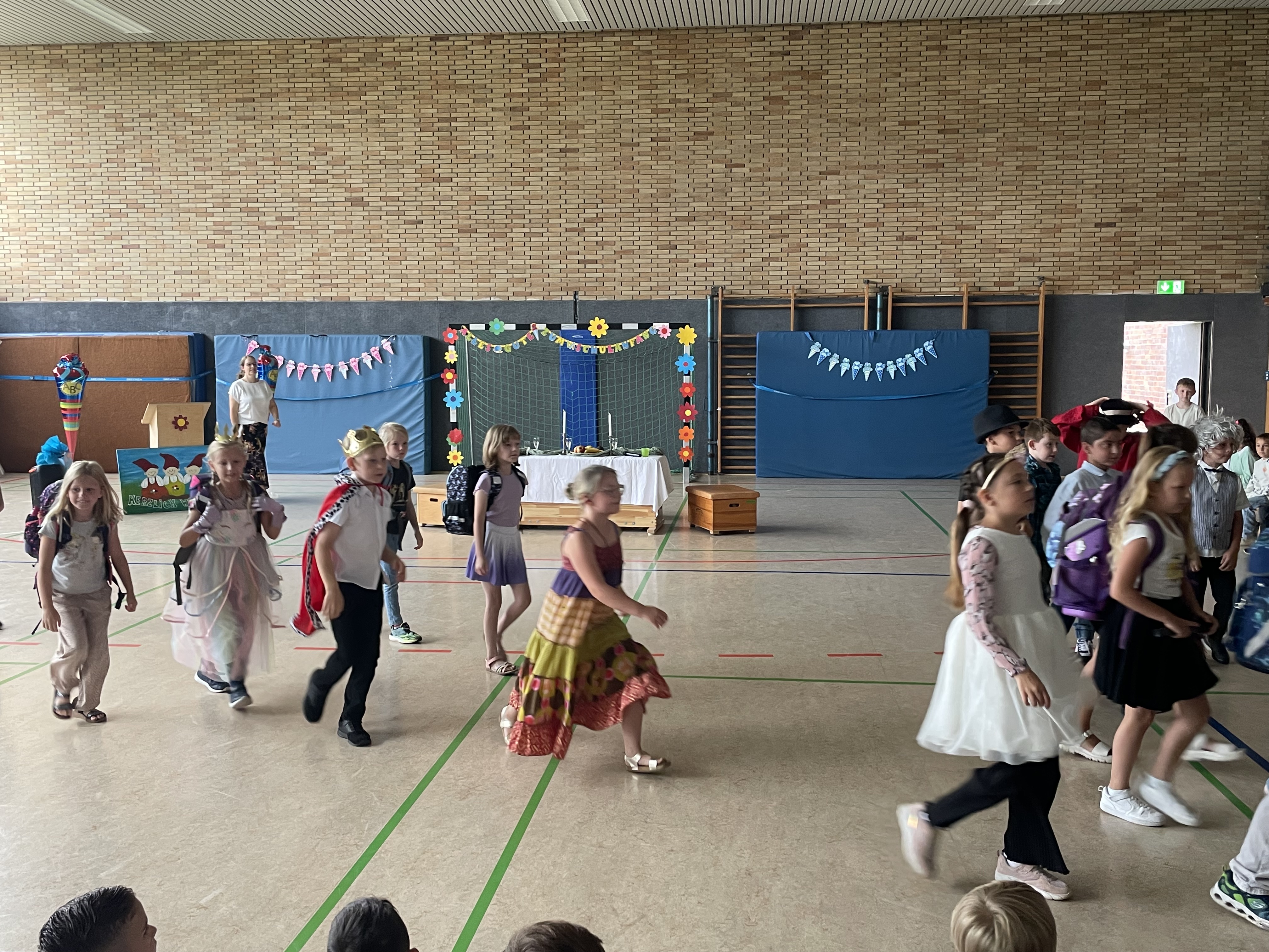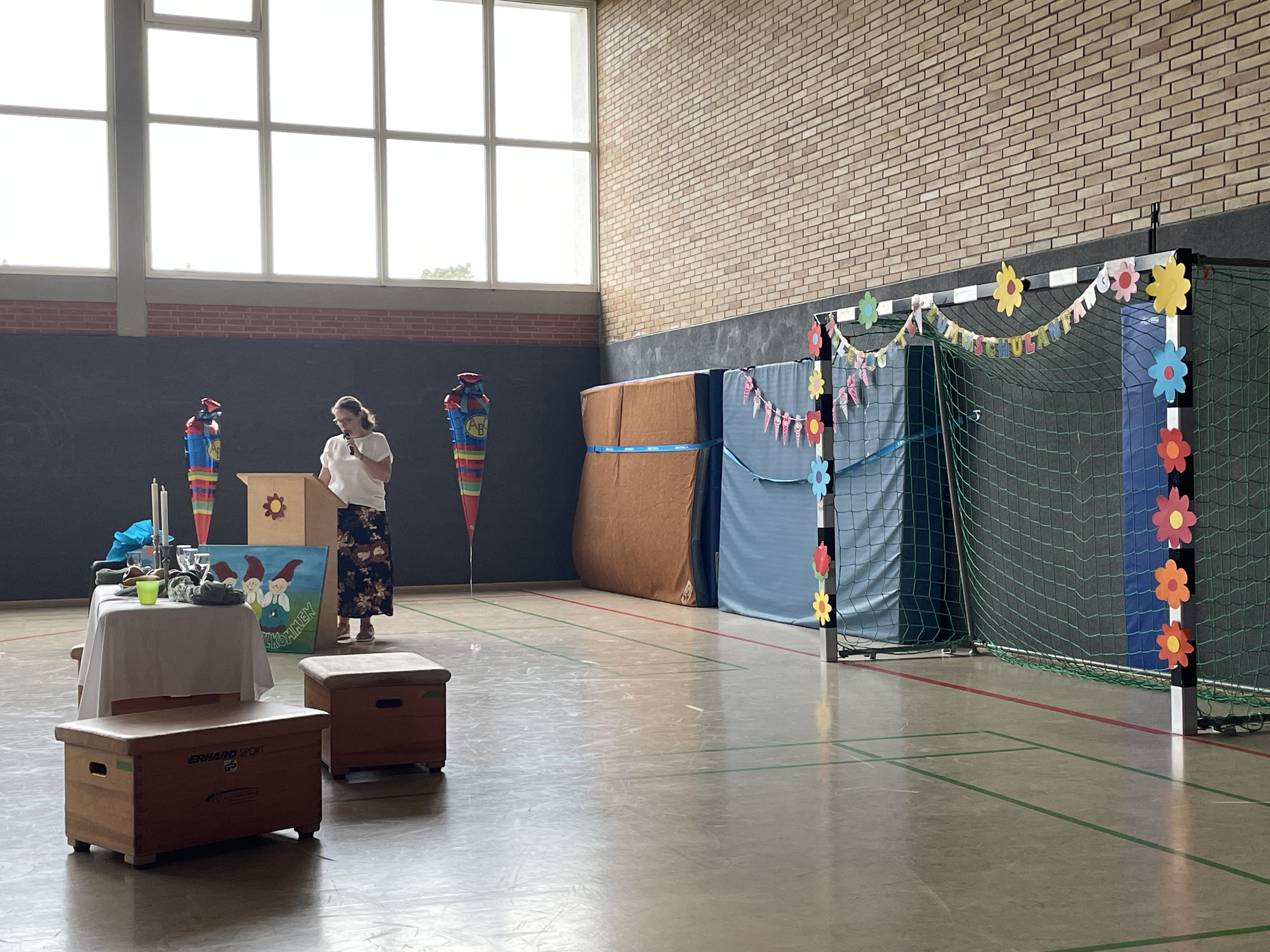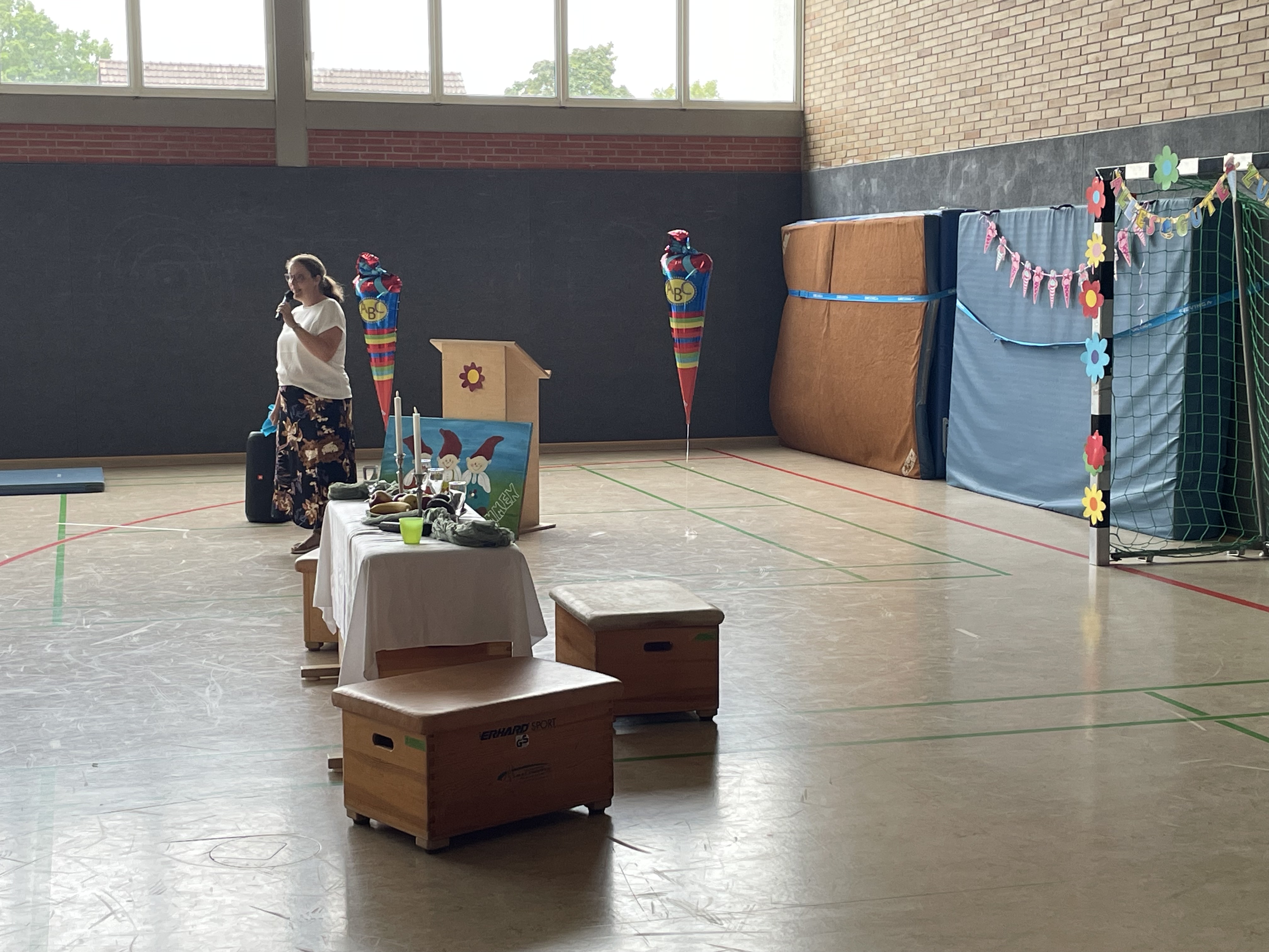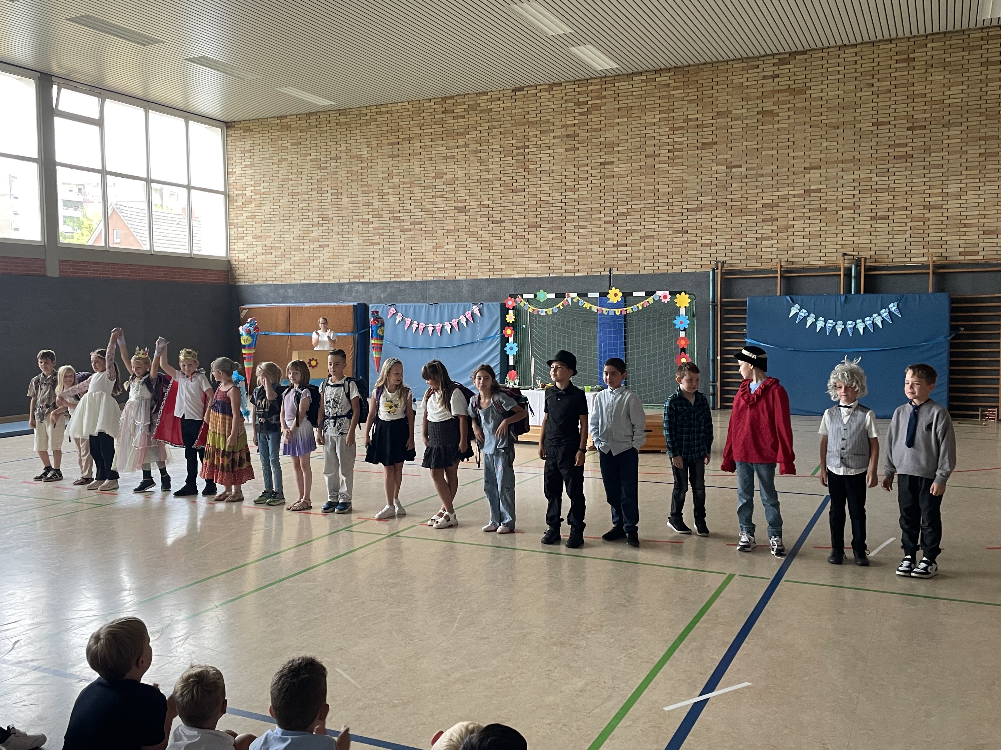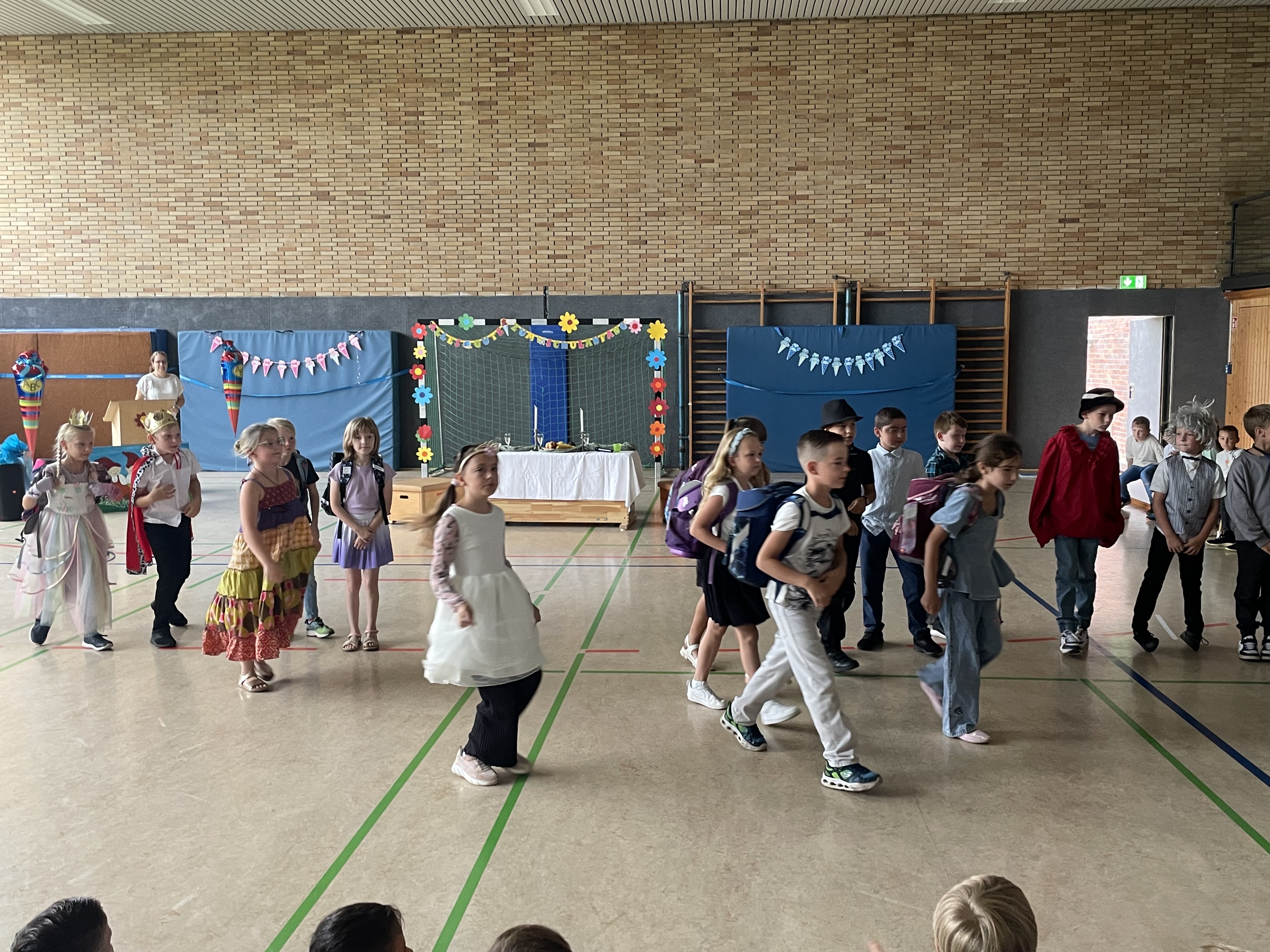 Am vergangenen Samstag war es endlich soweit: In unserer Turnhalle feierten wir die Einschulung der neuen Erstklässlerinnen und Erstklässler. Die kommissarische Schulleiterin Daniela Stockhorst hieß die Kinder und ihre Familien sowie das gesamte Kollegium herzlich willkommen und eröffnete die Feier.