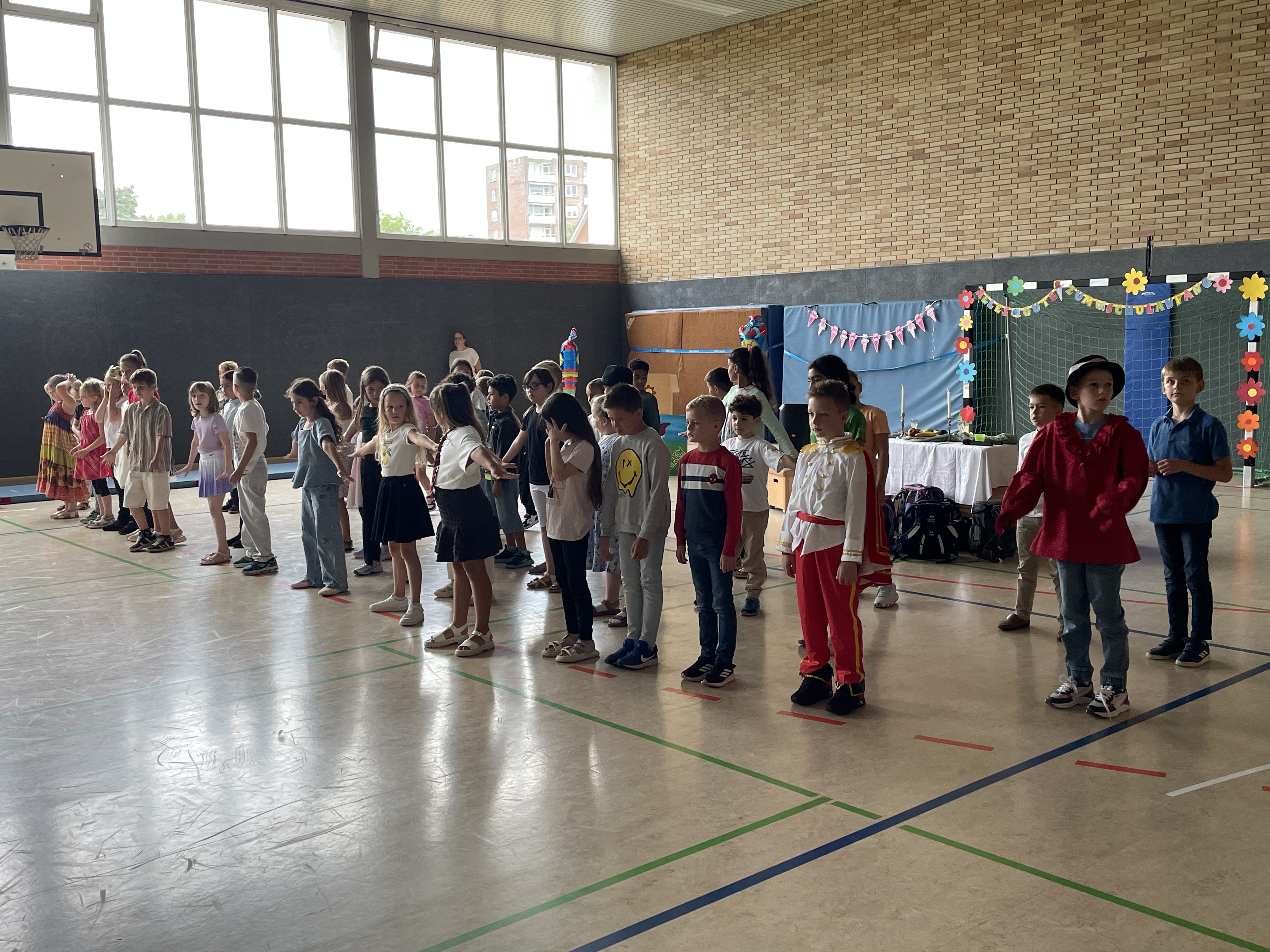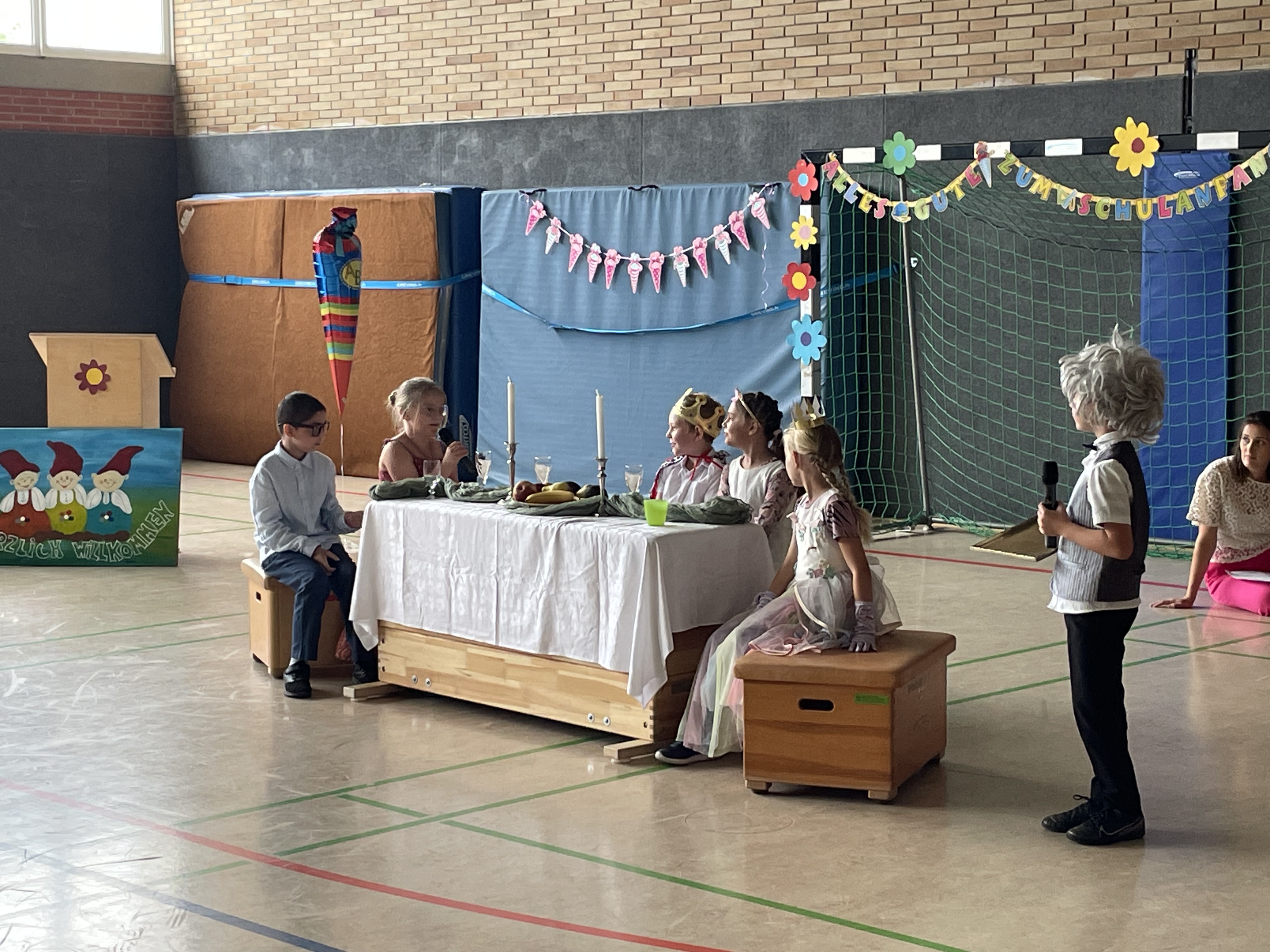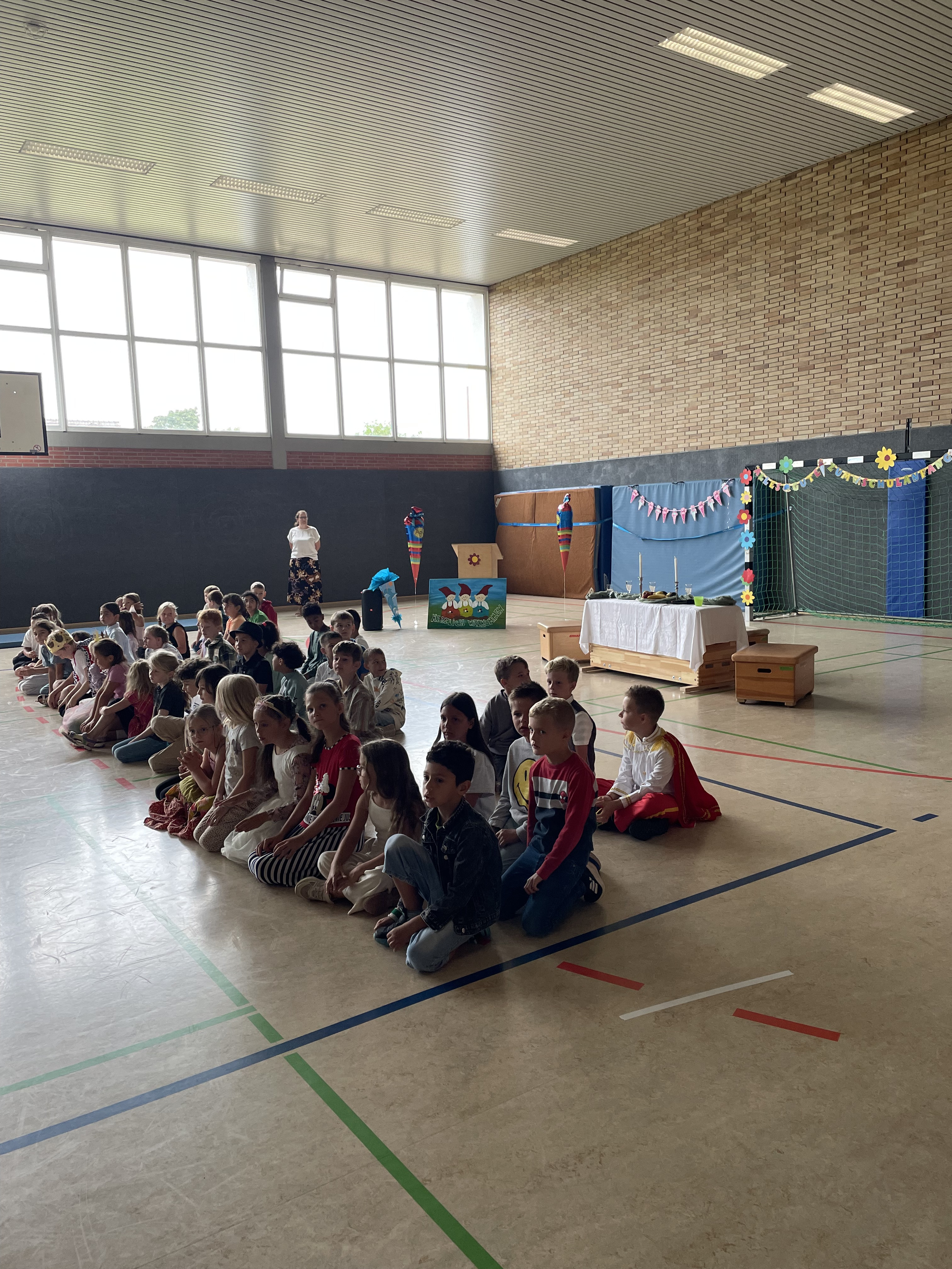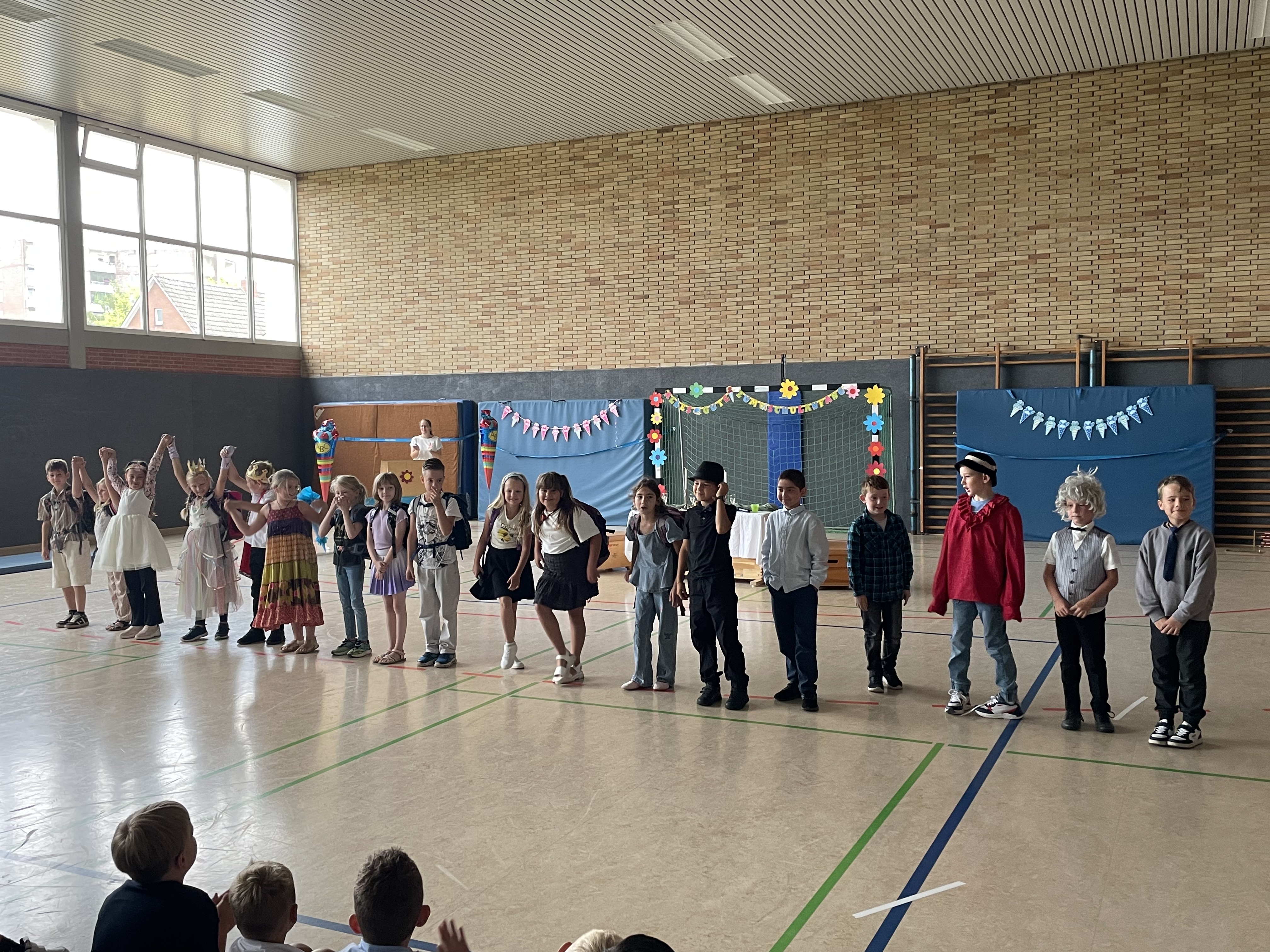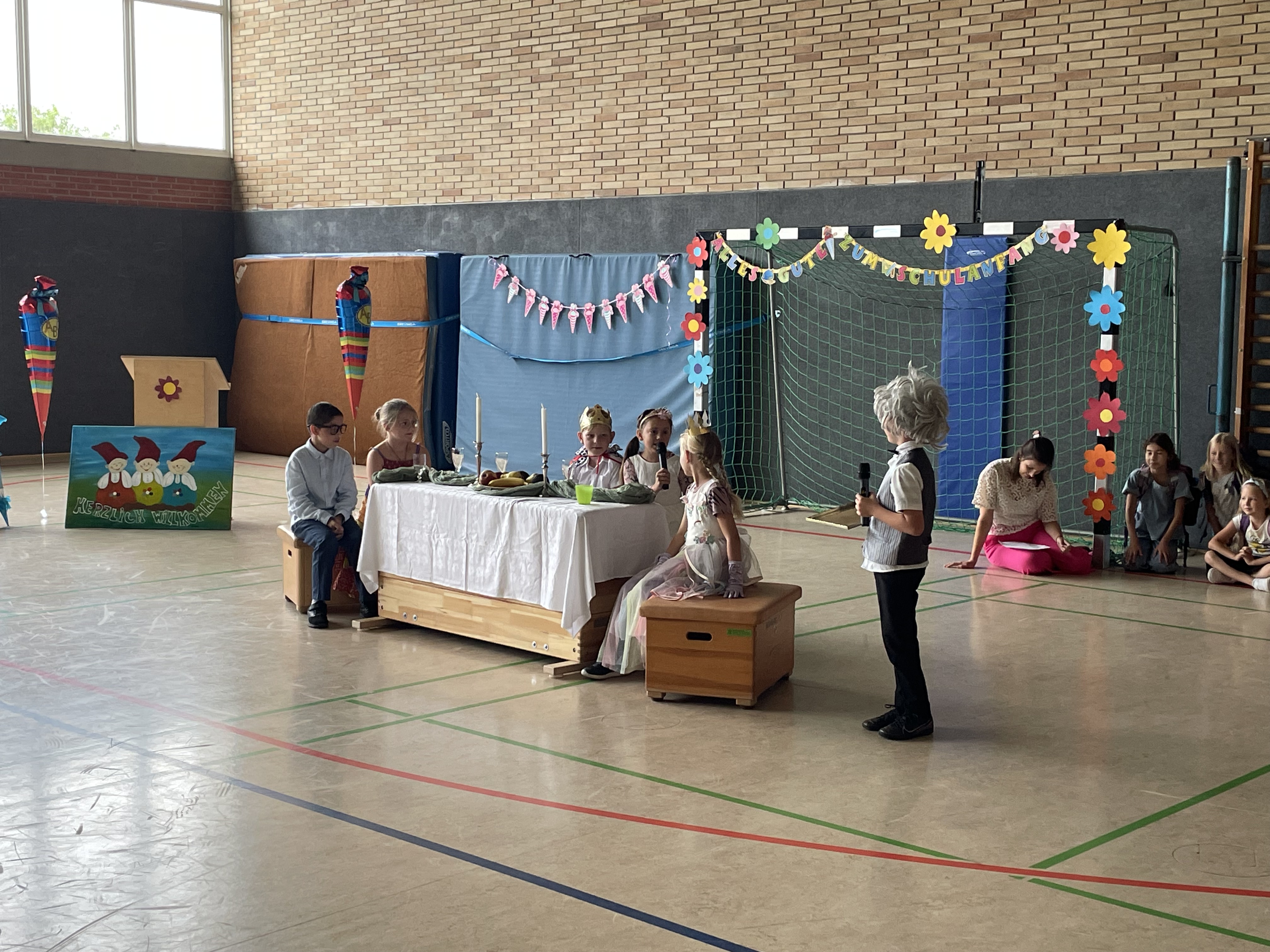 Am vergangenen Samstag war es endlich soweit: In unserer Turnhalle feierten wir die Einschulung der neuen Erstklässlerinnen und Erstklässler. Die kommissarische Schulleiterin Daniela Stockhorst hieß die Kinder und ihre Familien sowie das gesamte Kollegium herzlich willkommen und eröffnete die Feier.