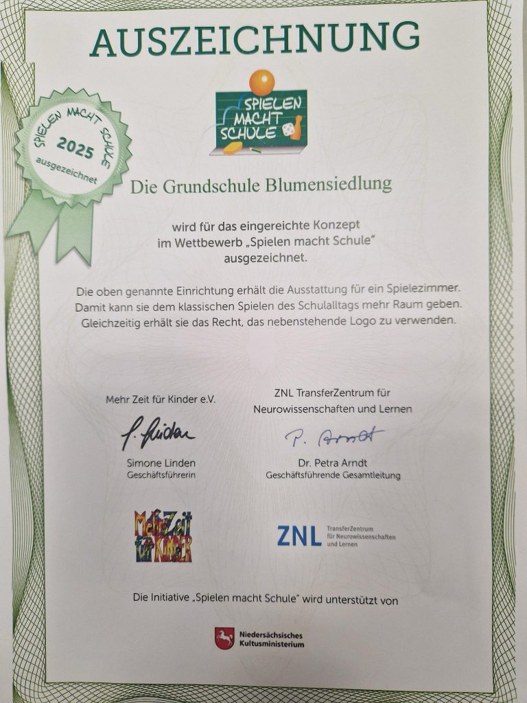 Wir freuen uns sehr, mitteilen zu können: Unsere Schule wurde im Rahmen der Initiative „Spielen macht Schule“ ausgezeichnet! Mit unserem eingereichten Konzept konnten wir die Jury überzeugen und haben die Ausstattung für ein eigenes Spielzimmer gewonnen.