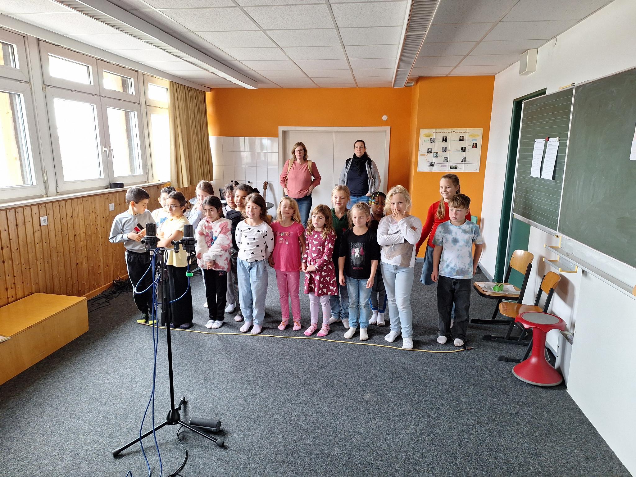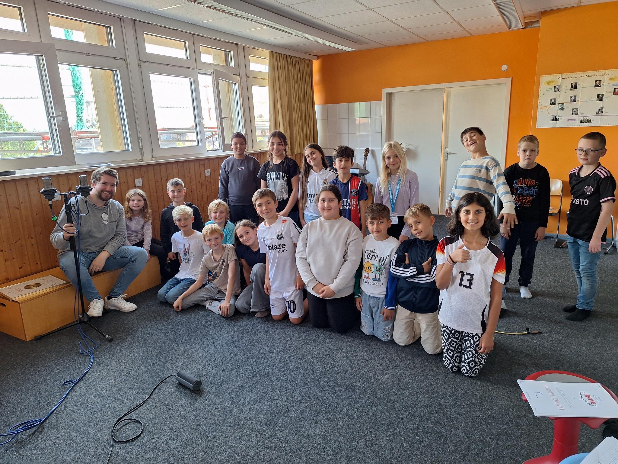 Danach ging es spannend weiter: Jede Klasse durfte nacheinander in den Musikraum und mit Jacobs Hilfe ihr Lied aufnehmen. Ganz schön aufregend war das, mit den beiden Mikrofonen vor sich zu singen!