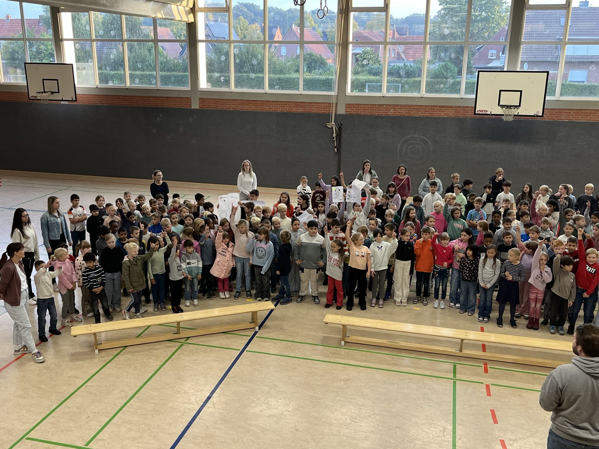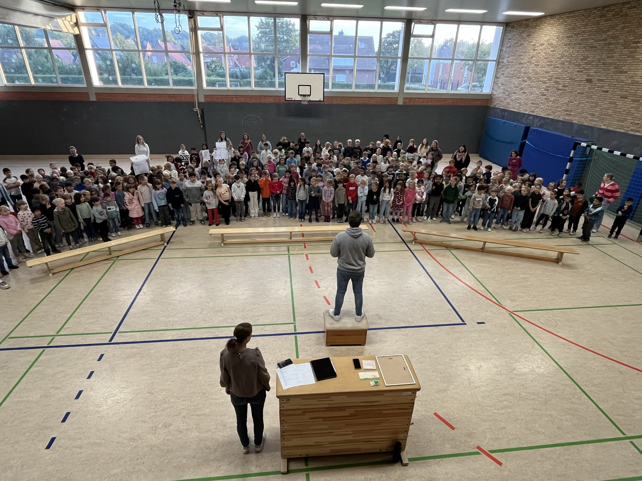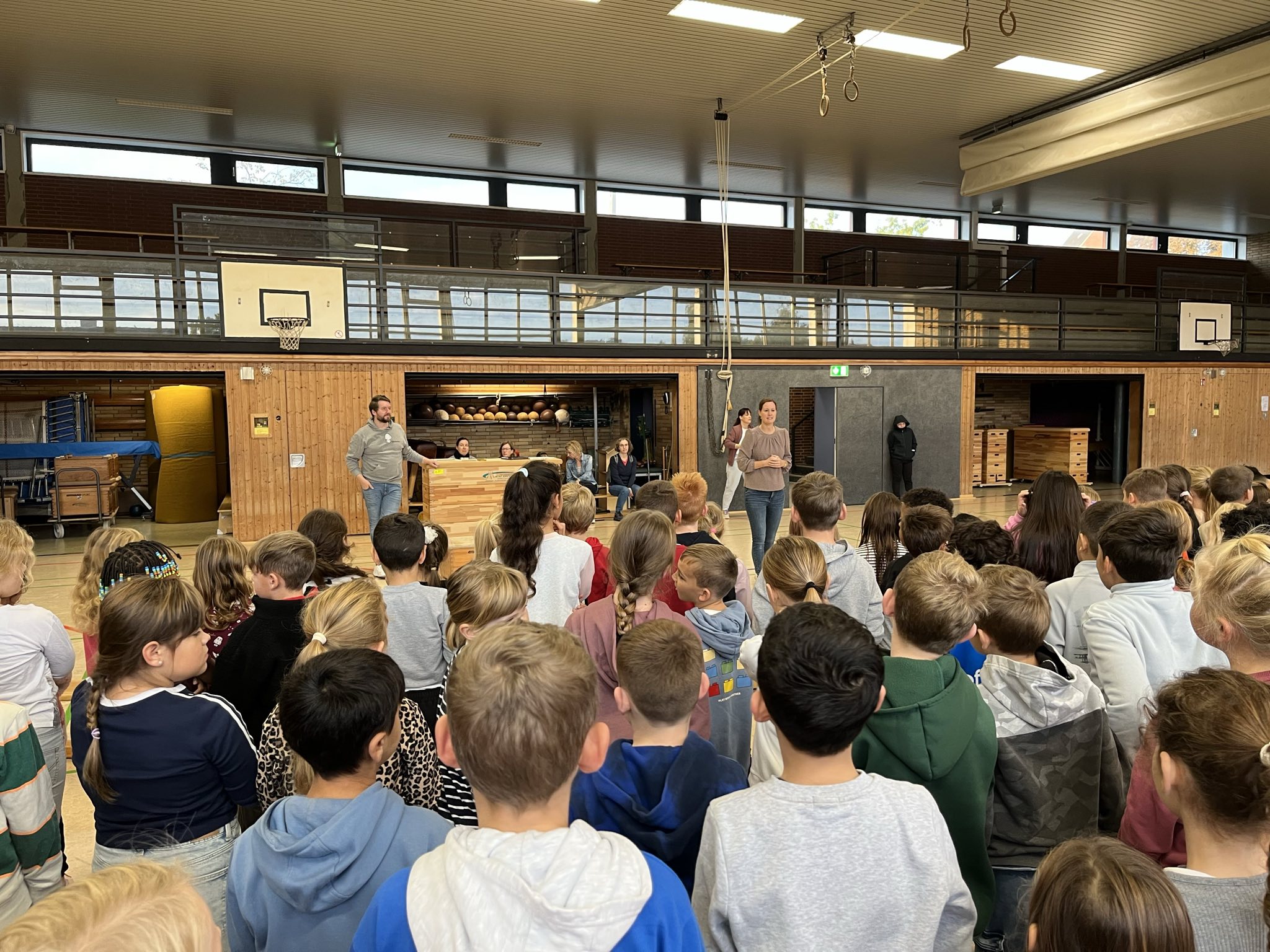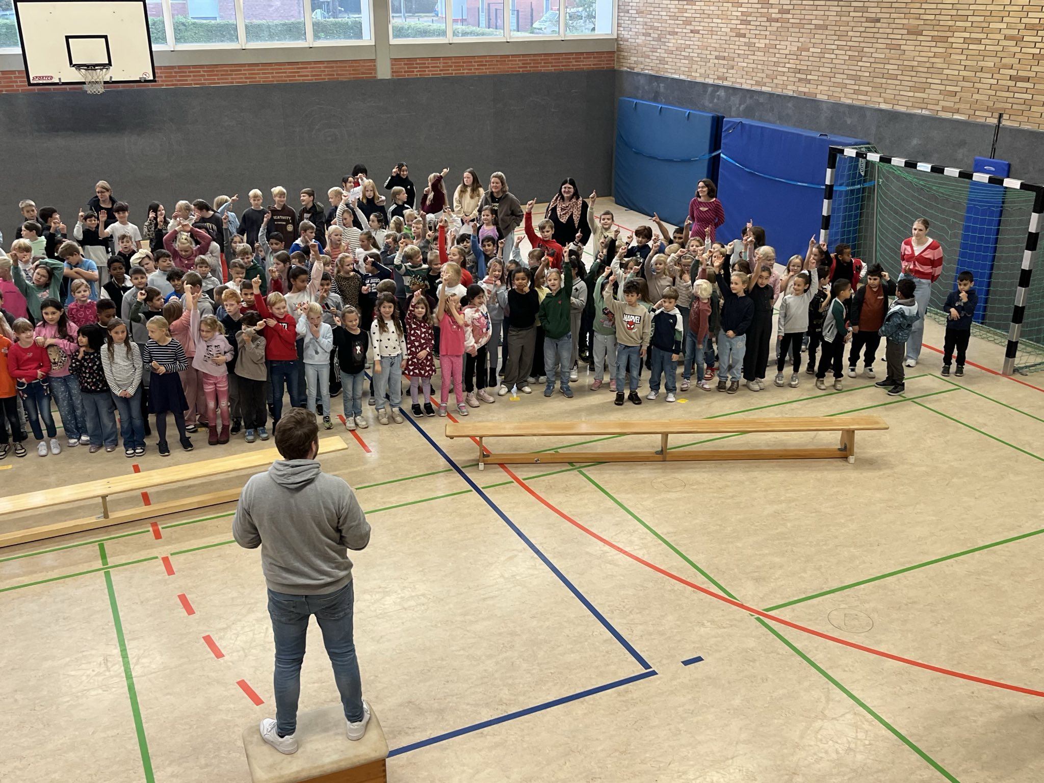 Los ging es in der 1. Stunde mit einem fröhlichen Warm-up in der Turnhalle. Dort begrüßte uns Jacob von den Minimusikern und gemeinsam sangen alle Kinder das Lied „Löwenstark“, um sich auf den Tag einzustimmen. Als Überraschung wurde uns sogar eine goldene Schallplatte überreicht – darauf sind wir sehr stolz!