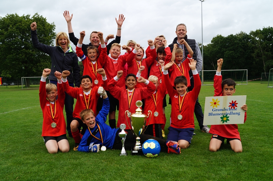 So seh´n Sieger aus! Grundschulmeister der Stadt Nordhorn 2015. Wer hätte das gedacht. Eigentlich wollten wir nur einen der sechs Pokale holen. Aber an diesen hat dabei eigentlich niemand gedacht. Wir nehmen ihn aber gerne und freuen uns riesig. Das erste Spiel am Samstag lief noch etwas schleppend. Aber dann kamen wir in Schwung und steigerten uns von Spiel zu Spiel und die Hoffnung wuchs und wuchs. Alle kämpften und gaben ihr Bestes. Den Lohn für diesen tollen Einsatz bekamen wir nach unserem siebten Spiel als nach langen 10 Minuten endlich der Schlusspfiff ertönte kannte der Jubel keine Grenzen mehr. Wir sind Grundschulmeister 2015. Und das kann uns keiner mehr nehmen.