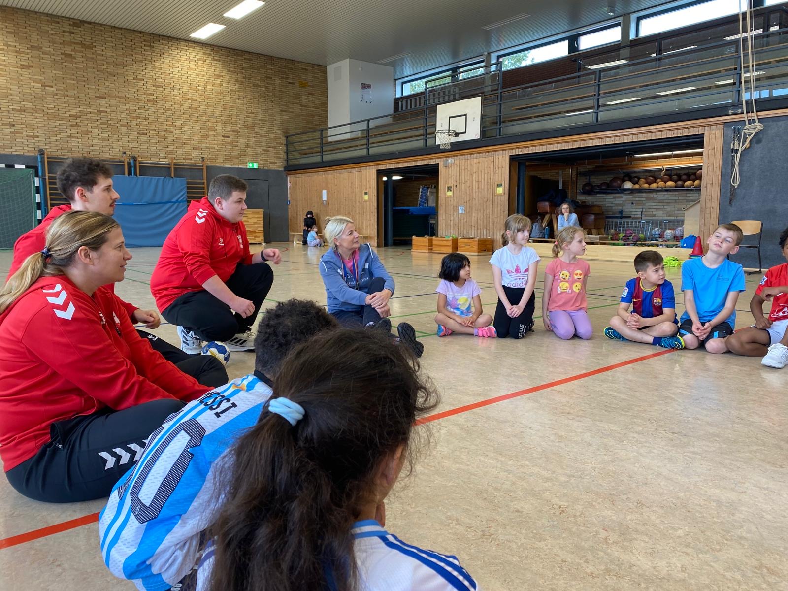 Simone Arendt, Jan-Arne Schakel und Maximilian Jäger (Profispieler der 1. Herrenmannschaft der HSG Nordhorn-Lingen) zeigten den Kindern grundlegende Techniken und Spielregeln des Handballsports.